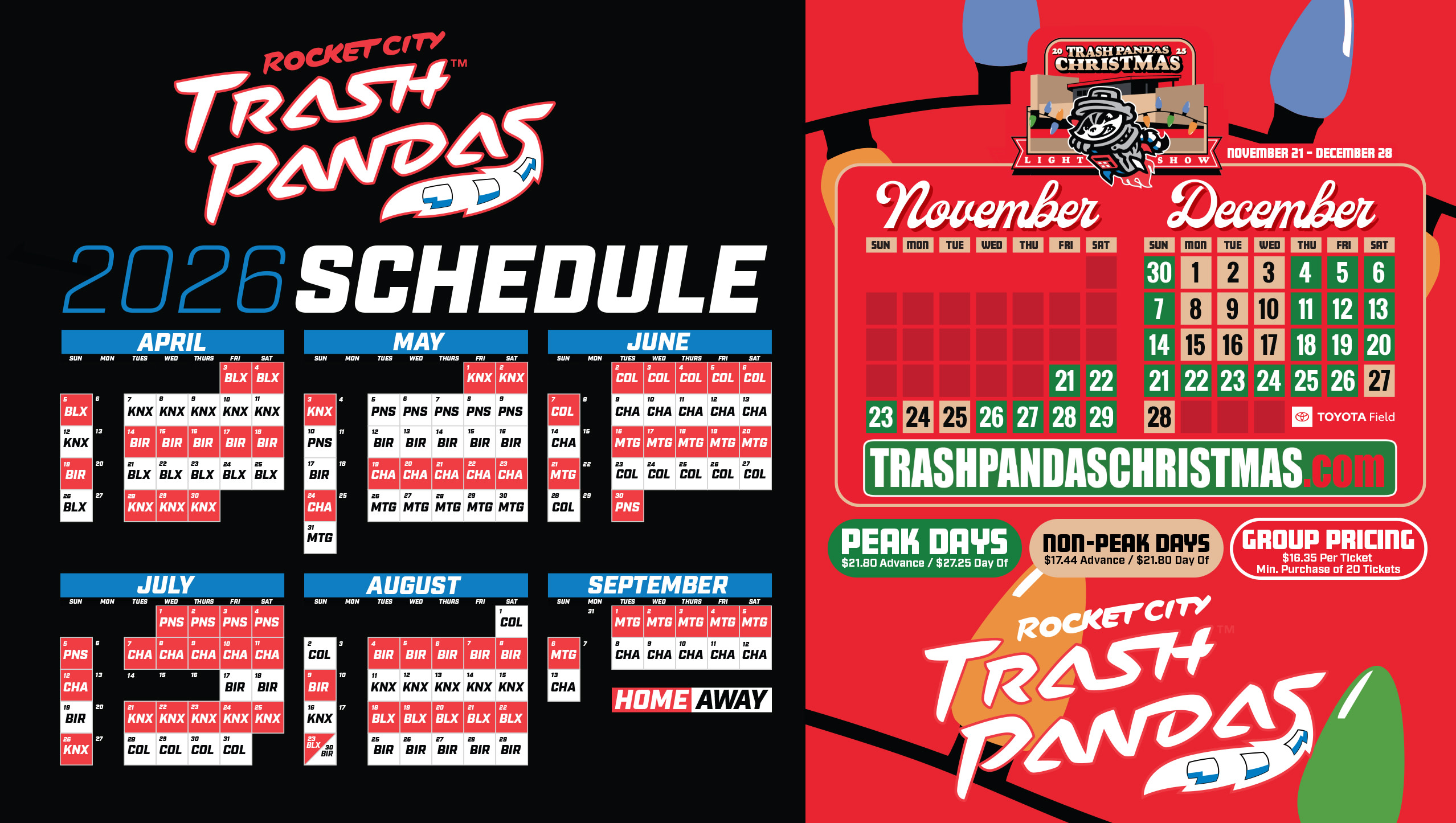 "This year's Christmas Light Show will be better than anything we've done before at Toyota Field," said Garrett Fahrmann, General Manager of the Rocket City Trash Pandas. "By moving the experience inside the ballpark, fans will be surrounded by nearly a million lights, interactive displays, and holiday activities that make this another one-of-a-kind Trash Pandas event."