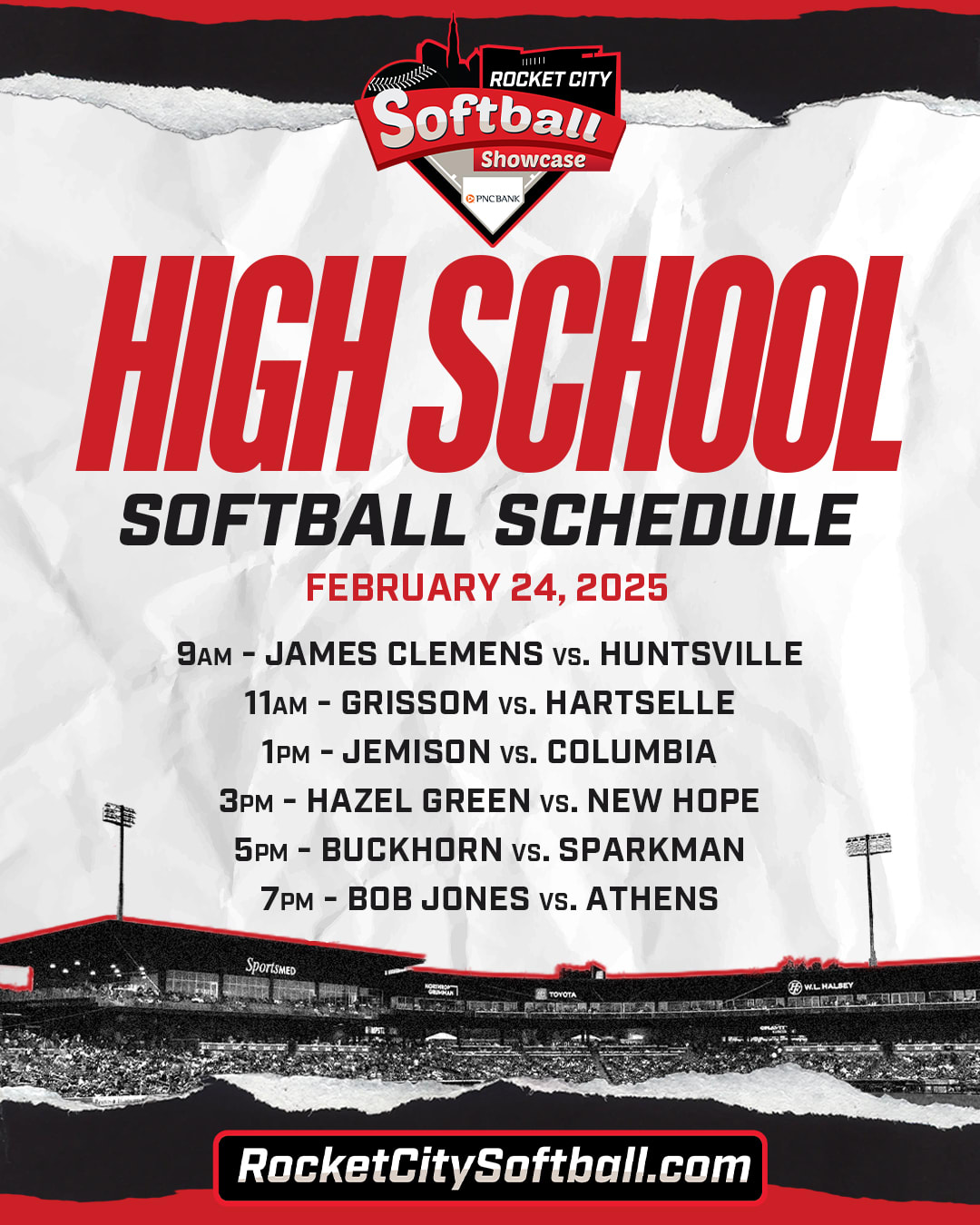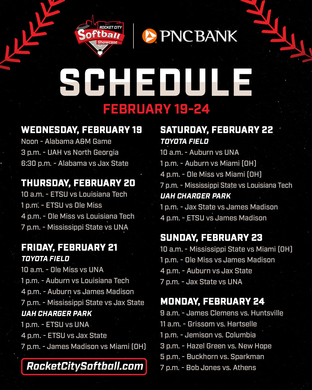 The playing surface at Toyota Field will sport a new configuration from February 19-24 for the 2025 Rocket City Softball Showcase, presented by PNC Bank! 13 NCAA Softball programs and 12 local high schools will play at the home of the Trash Pandas over the course of five days, including Alabama, Auburn, Mississippi State, and Ole Miss. Tickets for the Showcase start at $20 per day ($10 for the high school game day) and are available now!