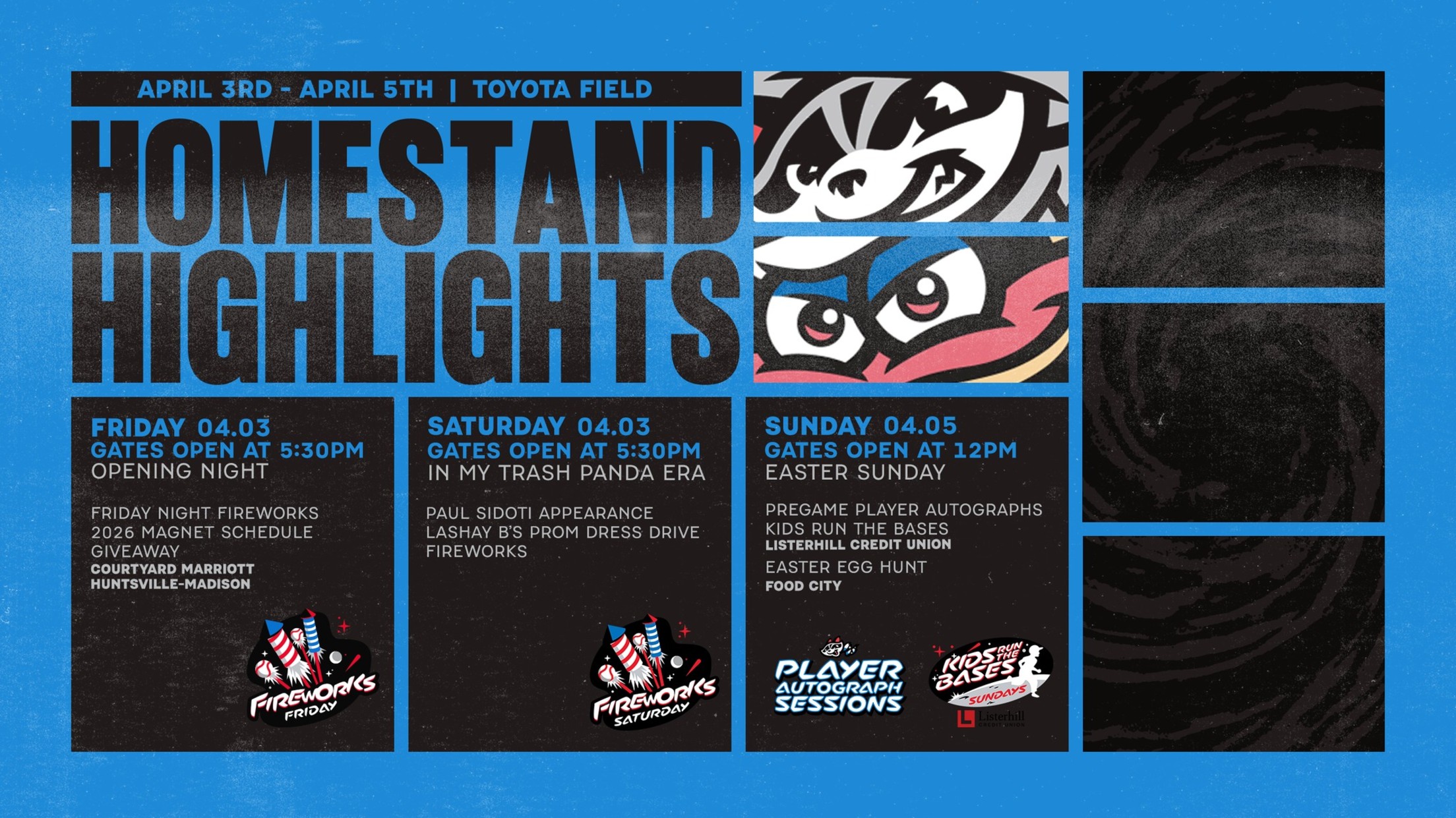 MADISON, Ala. – The Rocket City Trash Pandas open the 2026 season at Toyota Field with a three-game series against the Milwaukee Brewers' Double-A affiliate, the Biloxi Shuckers, from April 3–5. Opening Weekend is packed with can't-miss moments, including back-to-back fireworks shows (April 3–4), a special appearance by Paul Sidoti