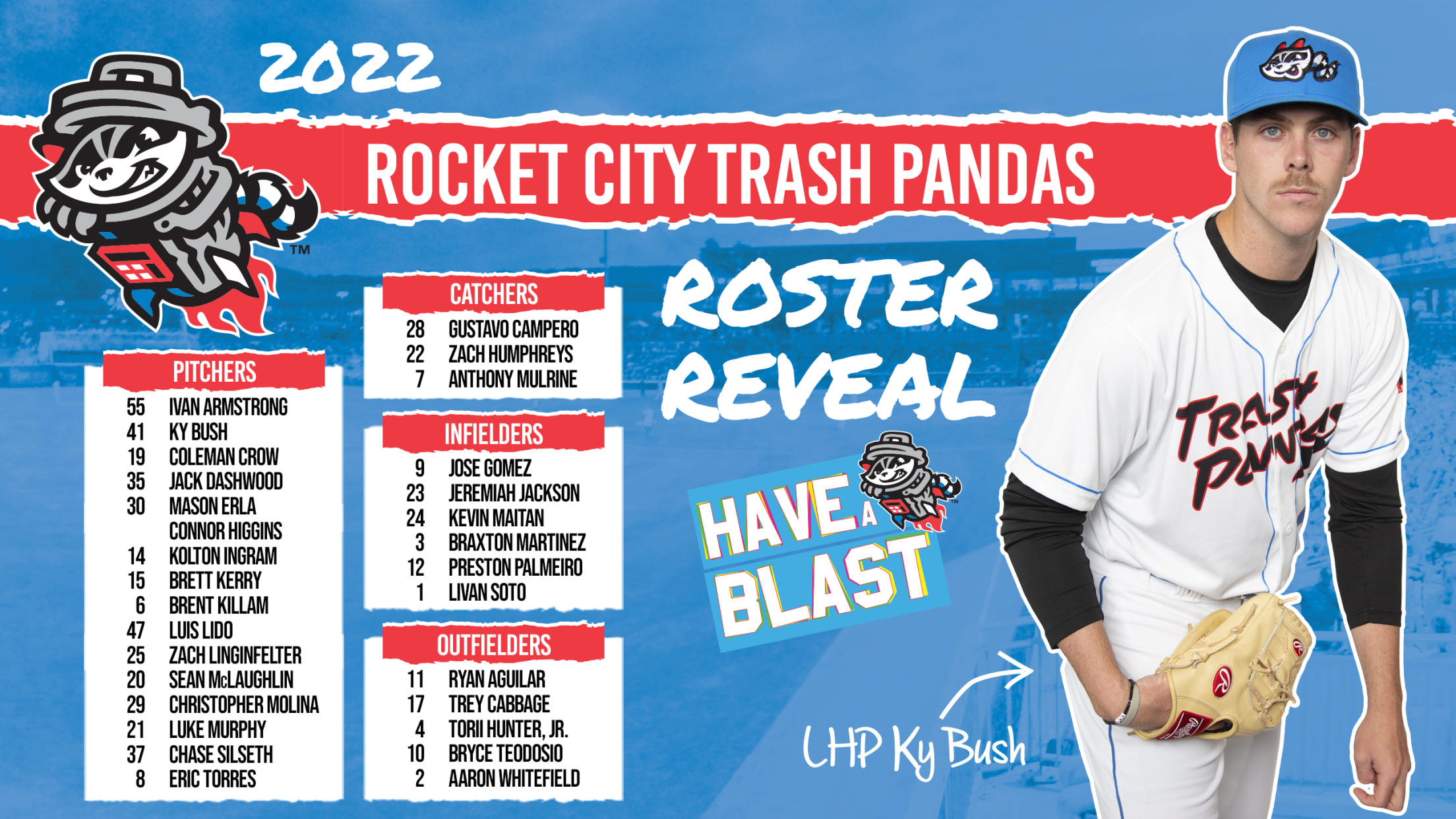 In conjunction with the Los Angeles Angels, the Rocket City Trash Pandas are proud to announce the preliminary roster for the second season in franchise history ahead of Opening Day against the Birmingham Barons on Friday, April 8.