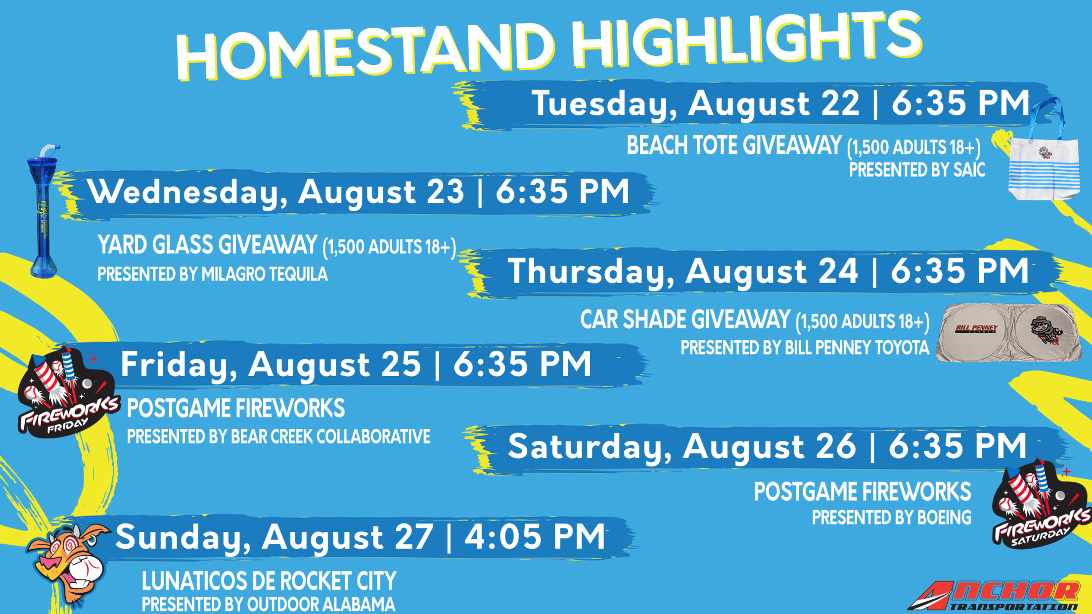 Time is running out to see the Rocket City Trash Pandas at Toyota Field in 2023. The team returns home next week for the penultimate homestand of the 2023 season featuring numerous giveaways, a pair of fireworks shows, the return of a fan favorite food item, and the final Lunaticos