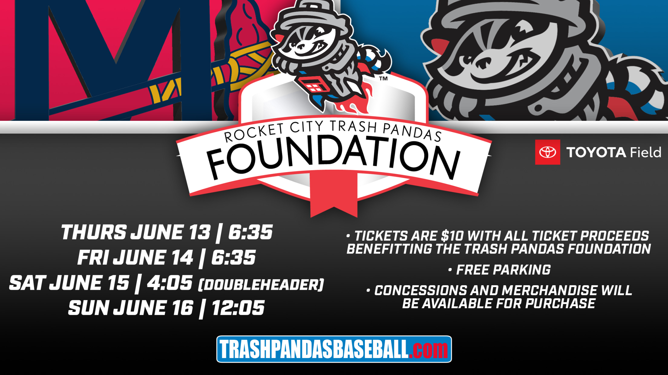 The two teams will play five games in four days beginning tomorrow, Thursday, June 13. Ticket proceeds will benefit the Trash Pandas Foundation and all reserved seats will be $10 (plus tax). Parking at Toyota Field will be complimentary throughout the five-game Father’s Day weekend series.