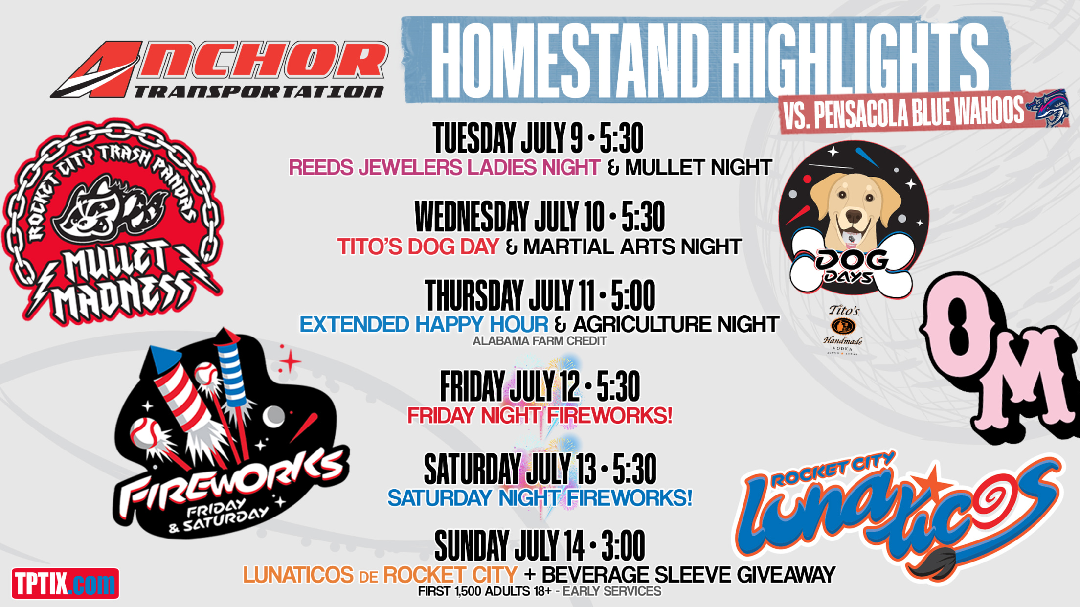 • Dog Day: This is the third Dog Day of the season sponsored by Tito’s! Fans can bring their four-legged friends to the ballpark which will benefit Greater Huntsville Humane Society.