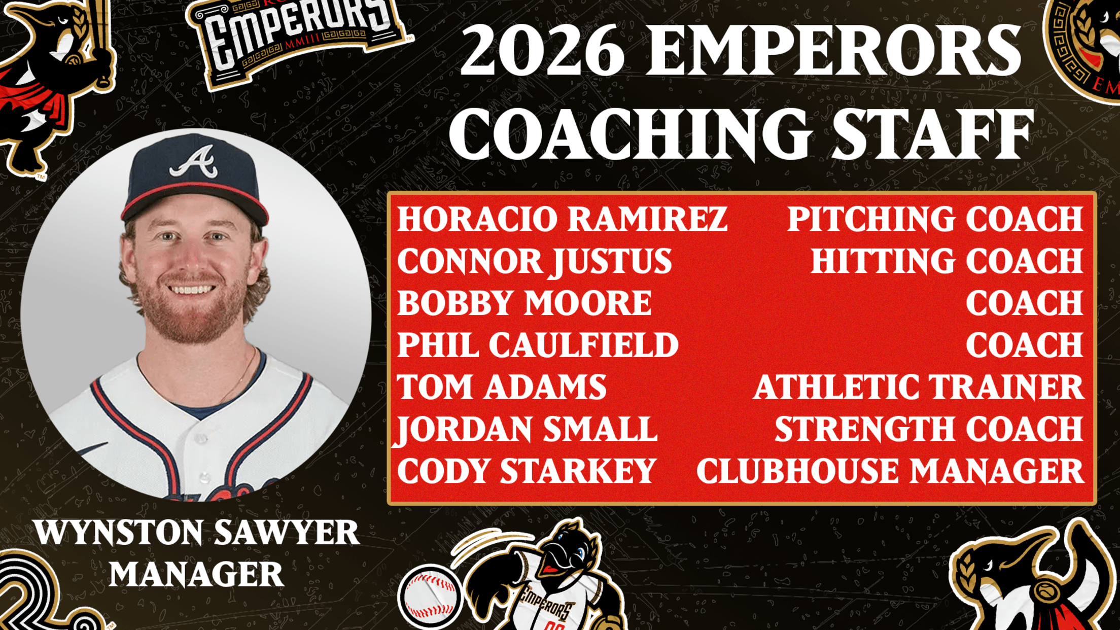 ROME, Ga – The Atlanta Braves, in conjunction with the Rome Emperors, today announced the High-A coaching staff, which includes the 14th and newest manager of the franchise, Wynston Sawyer. After managing the Single-A Augusta GreenJackets for two seasons, Sawyer makes the jump to High-A Rome for the 2026 season