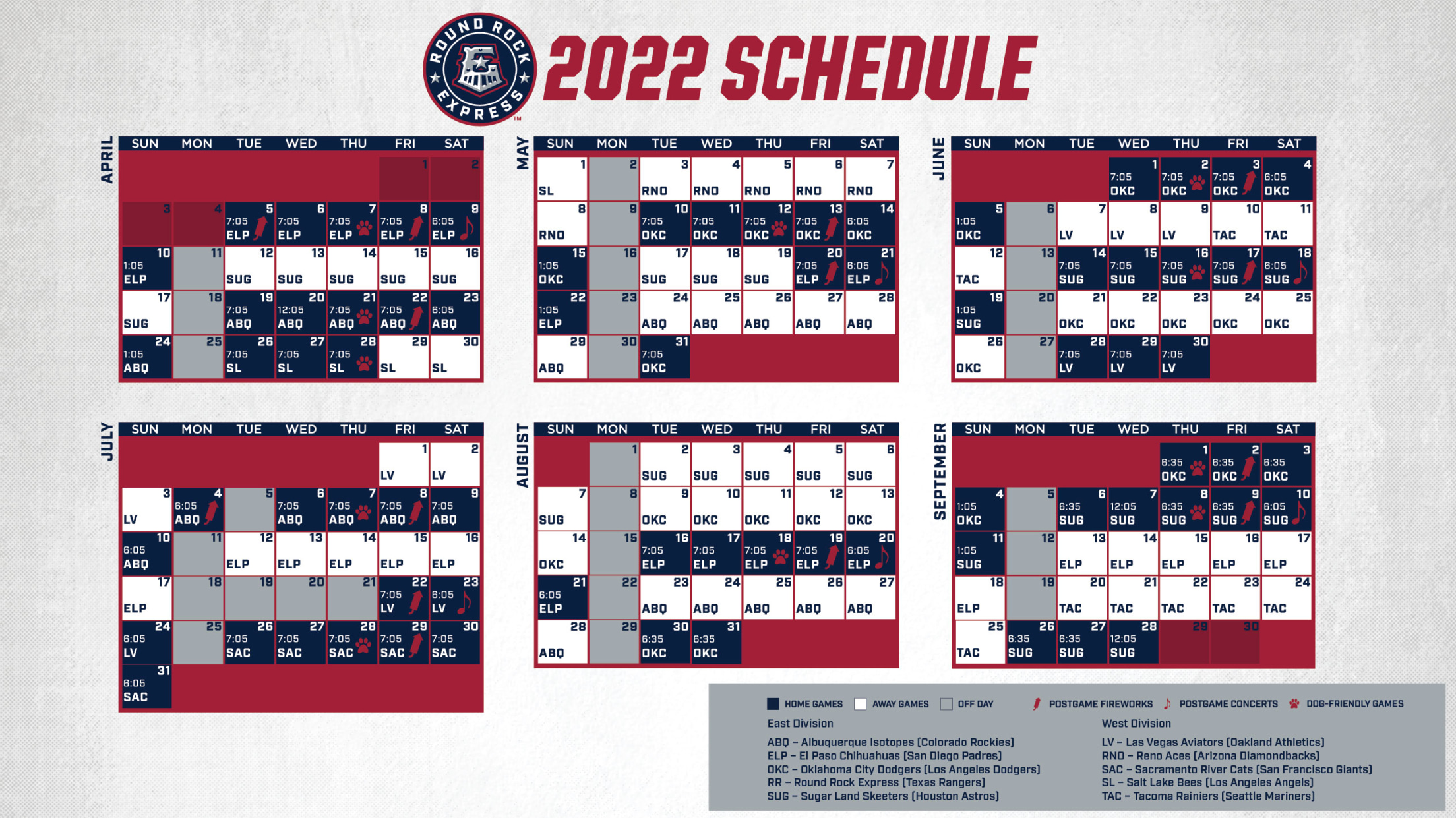 Under the new format, which more closely aligns with the conclusion of the Major League Baseball season, Round Rock’s previously scheduled three-game road series against the Tacoma Rainiers (Seattle Mariners affiliate) from Monday, September 19 through Wednesday, September 21 has been shifted back a day and extended to a six-game set. Monday, September 19 is now an off-day before the Express and Rainiers face off at Cheney Stadium from Tuesday, September 20 through Sunday, September 25.