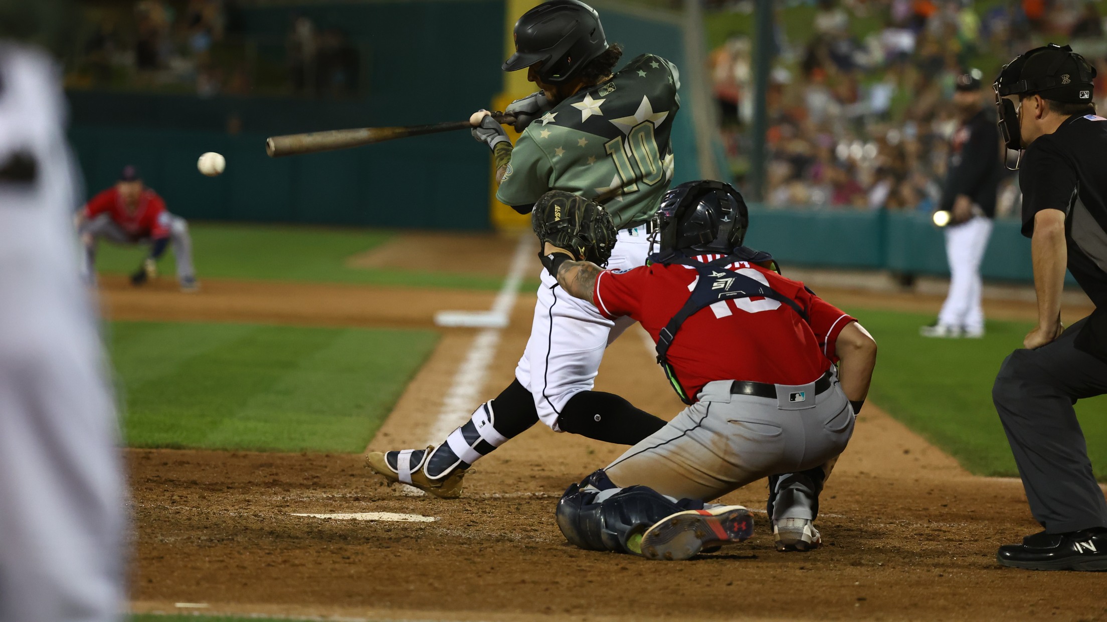 Sacramento infielder Isan Díaz lines a ball in the River Cats' Salute to Armed Forces game (5/21/22).
