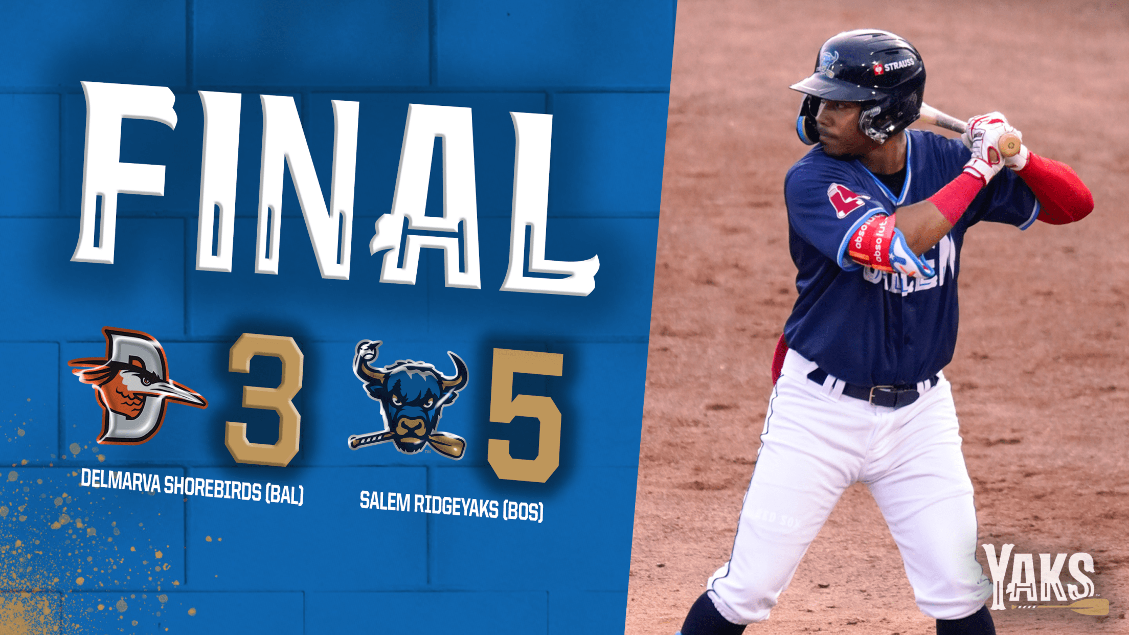 SALEM Va. – The Salem RidgeYaks (1-0) opened a new era Thursday night with a 5-4 victory over the Delmarva Shorebirds (0-1) to win their first game in RidgeYaks identity history at Carilion Clinic Field at Salem Memorial Ballpark. After 16 years of being known as the Salem Red Sox,