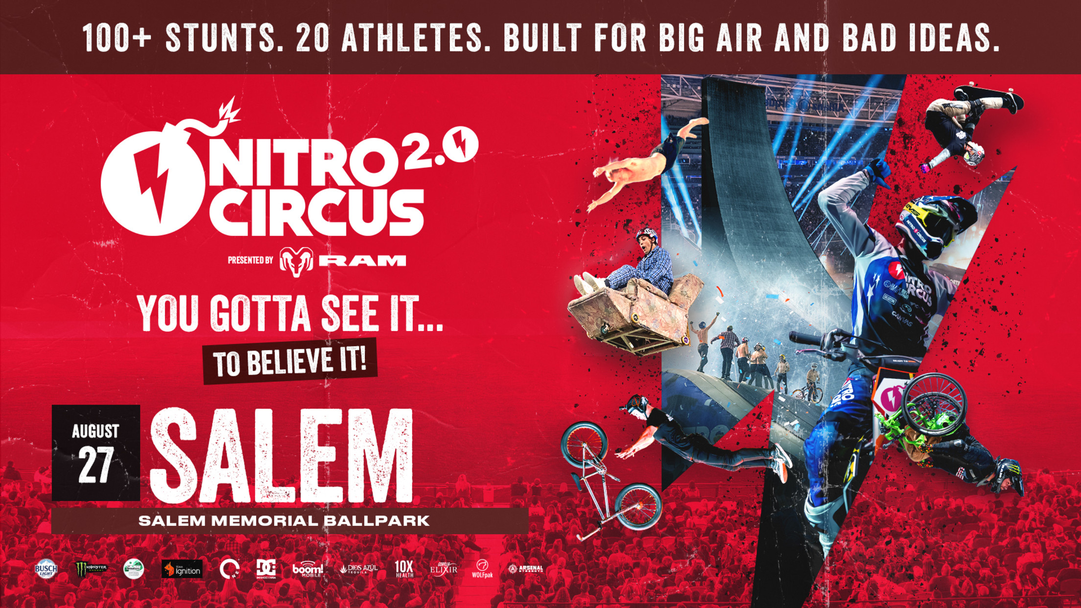 ALL NEW NITRO CIRCUS TOUR COMES TO SALEM! NITRO CIRCUS 2.0 TOUR PRESENTED BY RAM TRUCKS THURSDAY, AUGUST 27 CARILION CLINIC FIELD NEVER BEEN DONE. NEVER BEEN SEEN. ABSOLUTELY UNREAL. You gotta see it to believe it!100+ STUNTS. 20 ATHLETES. BUILT FOR BIG AIR AND BAD IDEAS.