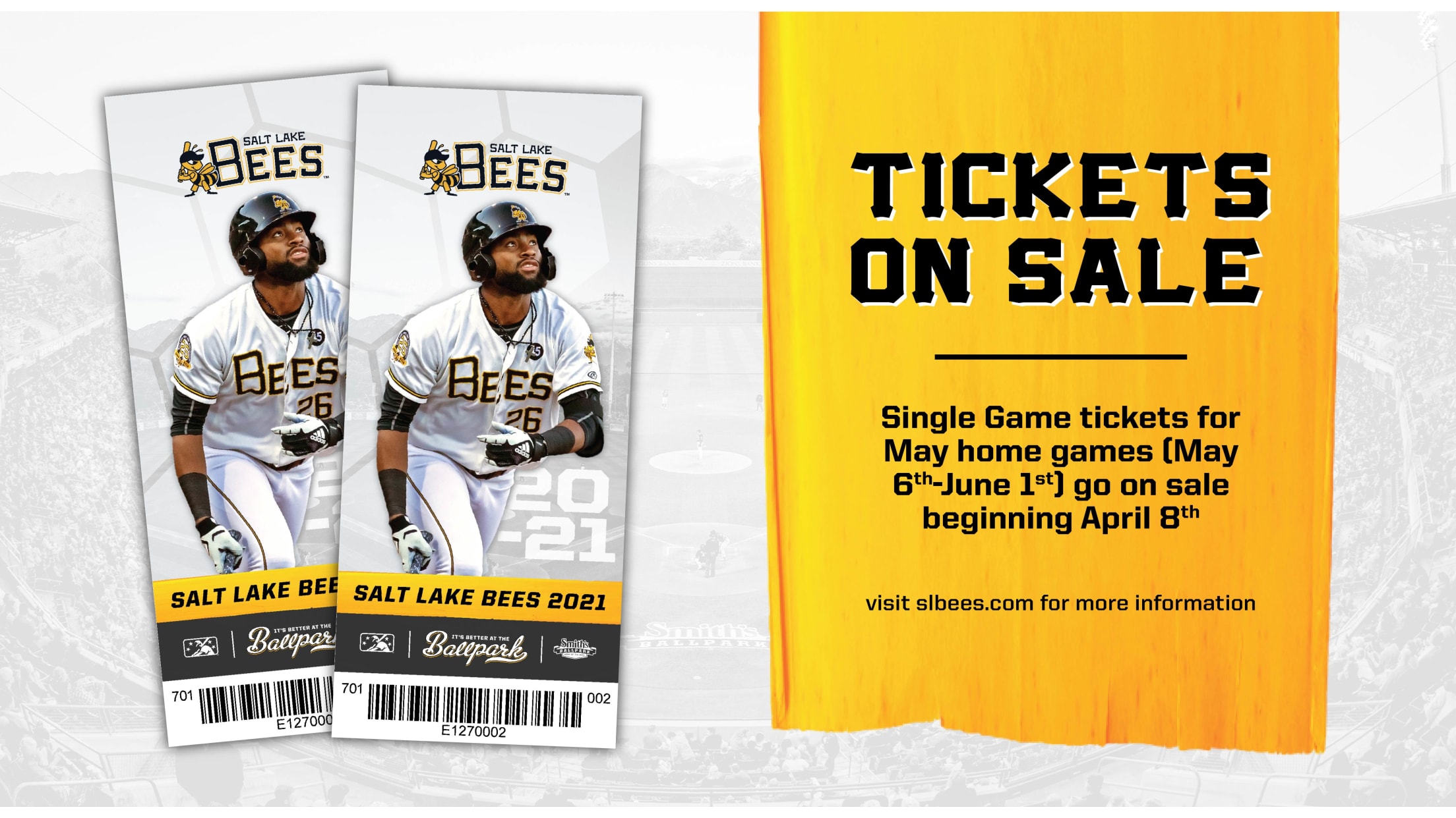 Single game tickets for games at Smith’s Ballpark from May 6-June 1 will go on sale Thursday, April 8 at 10 a.m. online at www.slbees.com or by phone and text at 801-325-BEES (2337).