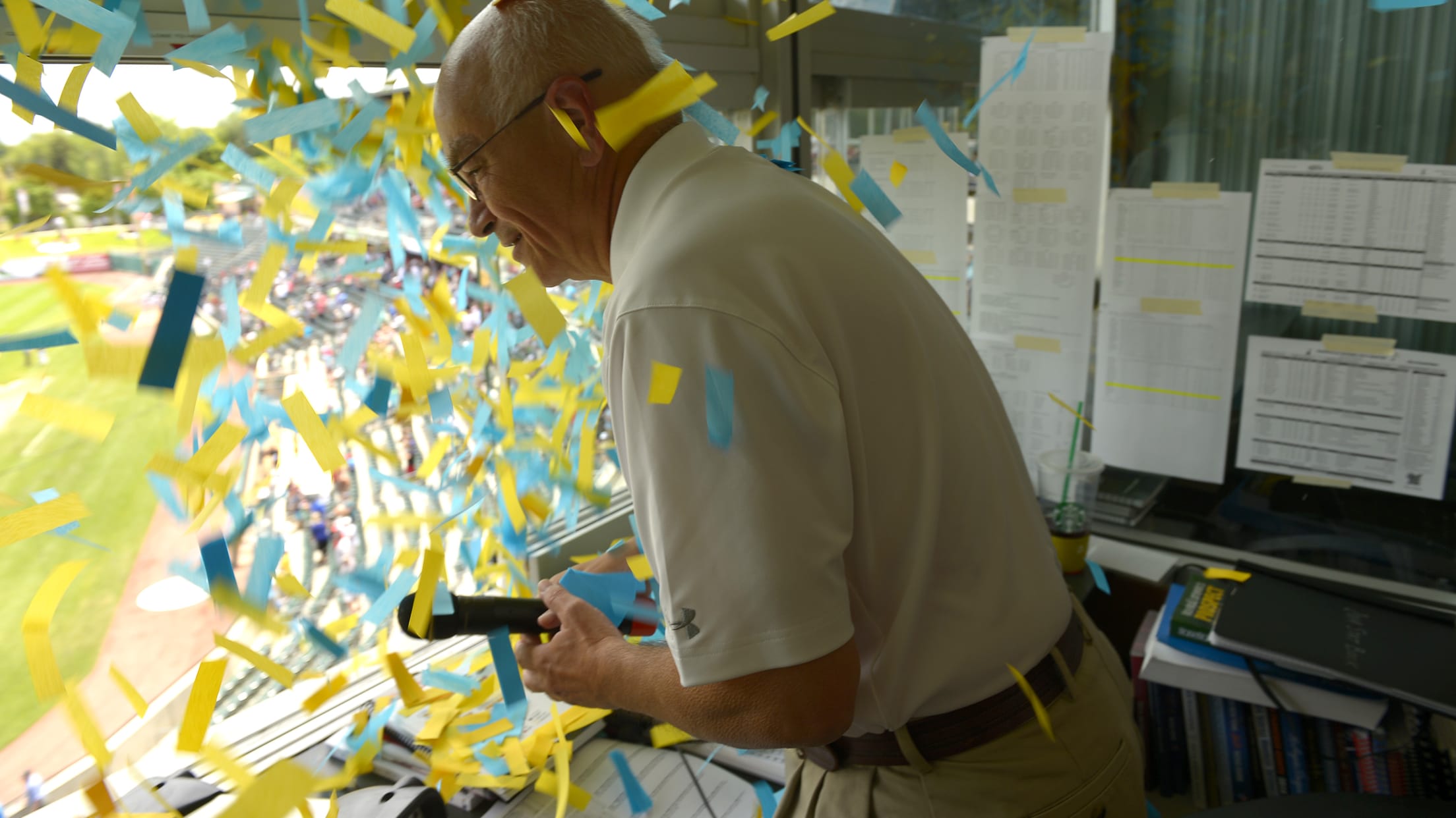 After singing "Take Me Out To The Ballgame" acapella during the 7th inning stretch, announcer Steve Klauke is peppered confetti when Buzz the mascot fires at him. Salt Lake Bees announcer Steve Klauke celebrates his 3,000th game, Tuesday, June 24, 2014, calling the Bee's game for SLC's Pacfic Coast League franchise. Klauke has the distinction of calling the most games a broadcaster has ever called for a single sports team in Utah history.