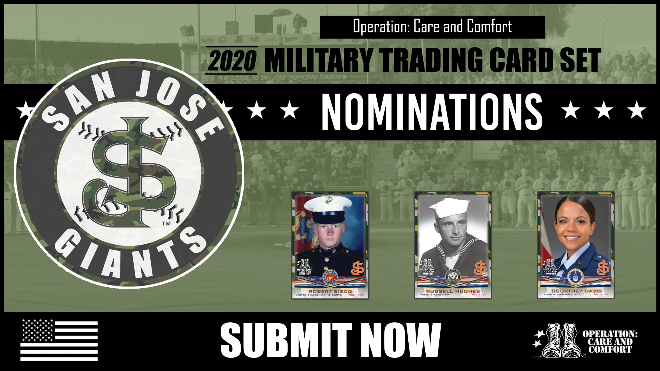 San Jose Giants Open 2020 Military Trading Card Set NominationsNominations for Operation: Care and Comfort's Custom Card Set being taken through March 1San Jose, CA- Today the San Jose Giants announced and opened nominations for the ninth annual Military Trading Card Set, presented by Operation: Care and Comfort. The trading