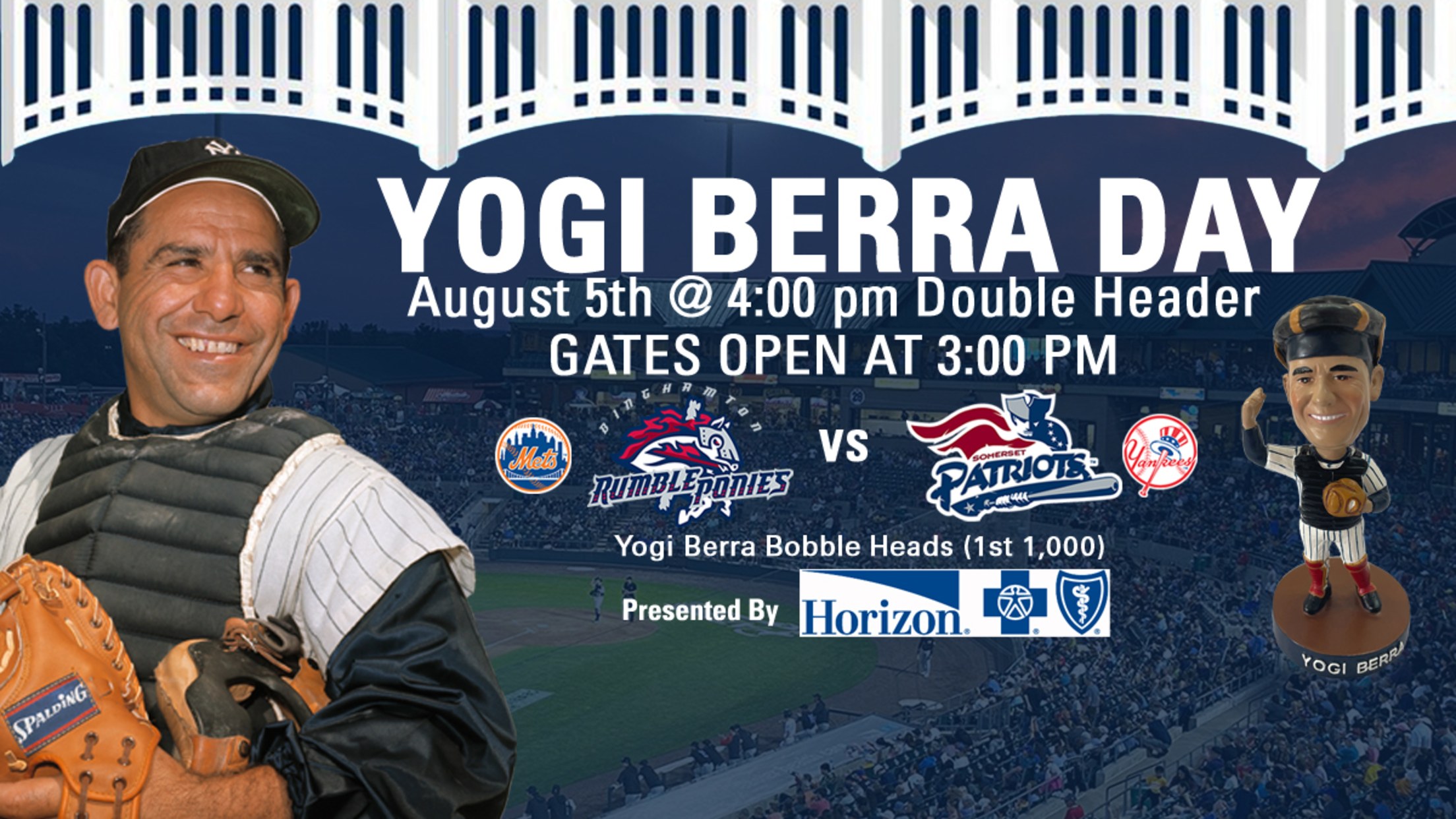 The first 1,000 fans in attendance will receive a Yogi Berra Bobblehead Doll courtesy of Horizon Blue Cross Blue Shield of New Jersey. Due to Thursday night's suspended game, there will now be a single admission double header beginning at 4:00 pm. Gates open at 3:00 pm for the Patriots’ games versus the Binghamton Rumble Ponies (New York Mets). The bobblehead distribution will now begin at 3:00 pm!!!