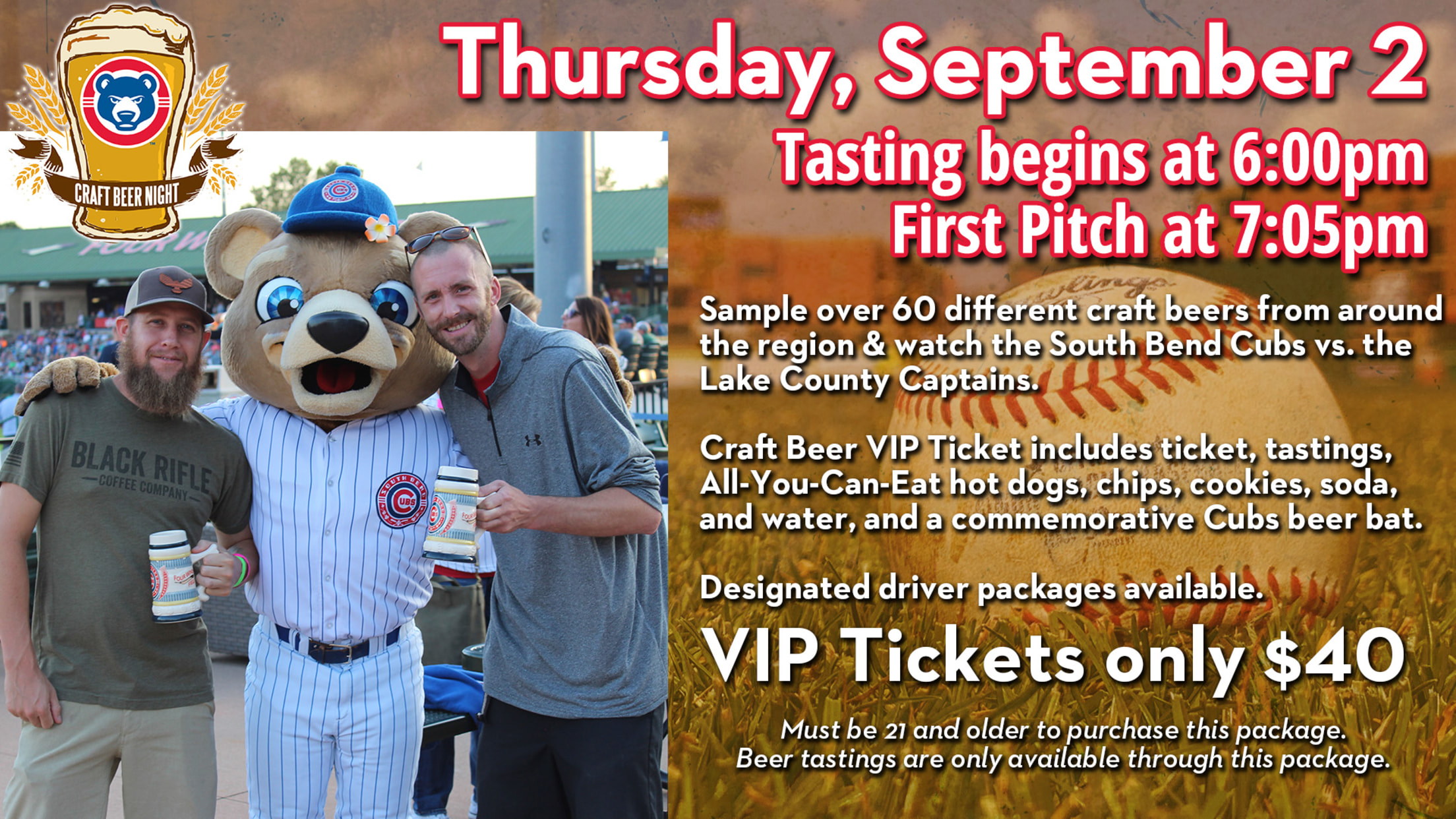 Tickets to Craft Beer Night will not be mailed out but will be available for pickup at the Four Winds Field Box Office on the day of the event. Beer bats can be picked up during the game on September 2 at the Cubs Den Team Store with a voucher given at will call. To purchase your ticket package, visit the Box Office or call (574) 235-9988. Tickets are not available online at this time.