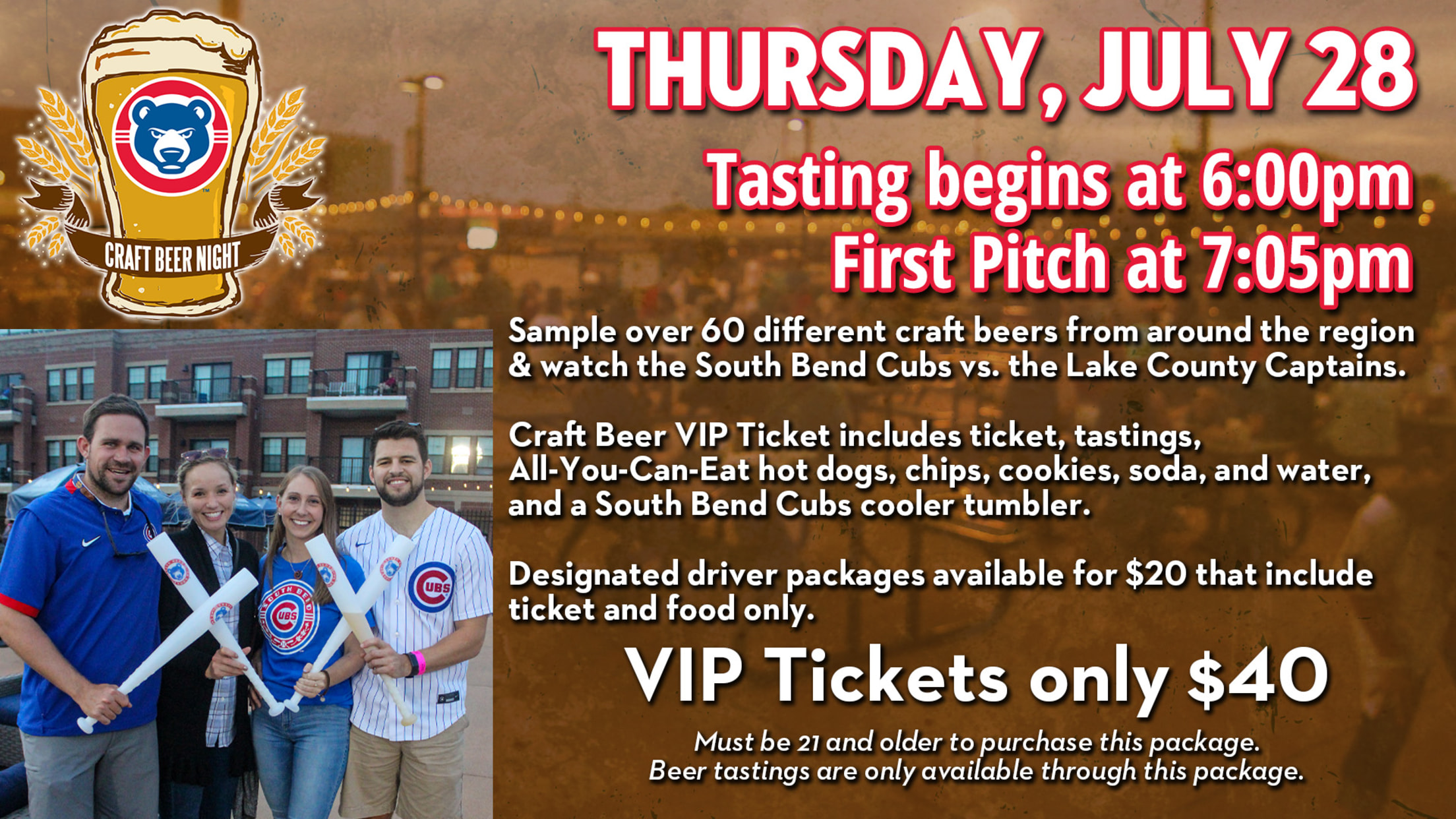 SOUTH BEND, IN - In what is always a popular evening on the baseball calendar, South Bend Cubs Craft Beer Night at Four Winds Field is officially set for this summer. On Thursday, July 28, fans will get to participate in sampling over 60 different craft beers from around the region. Gates open at 6:00 p.m. and first pitch is scheduled for 7:05 p.m. as the Cubs take on the Lake County Captains.