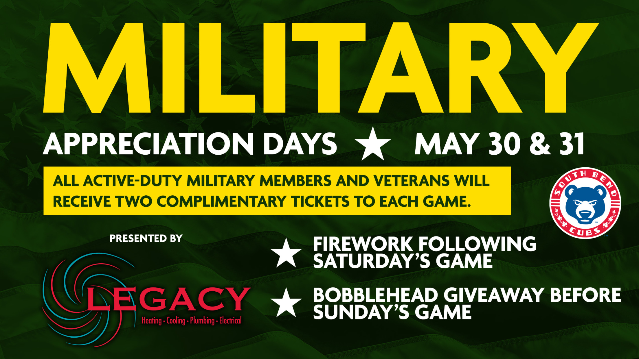 “Getting to see our active-duty military and Veteran heroes at the ballpark every Military Appreciation Weekend is something that is always special and dear to all of our hearts,” South Bend Cubs President Joe Hart said. “We would not be able to do what we do without our brave men and women serving and protecting us. With that in mind, partnering with Legacy Heating & Air to offer free tickets is the least we can do to show our appreciation.”