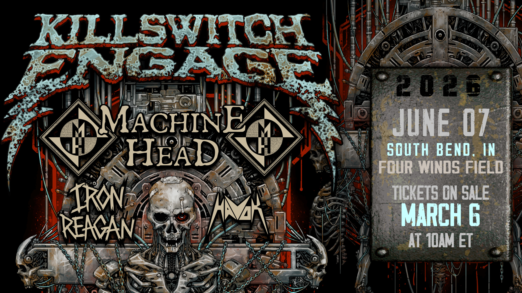 As announced on Real Rock 103.9 FM’s Jason Lee & Kluck Show, the tour rolls into South Bend, IN on Sunday, June 7 at Four Winds Field. Support will come from Machine Head, Iron Reagan, and Havok. Doors open at 5:00 p.m. and the music begins at 6:00 p.m.