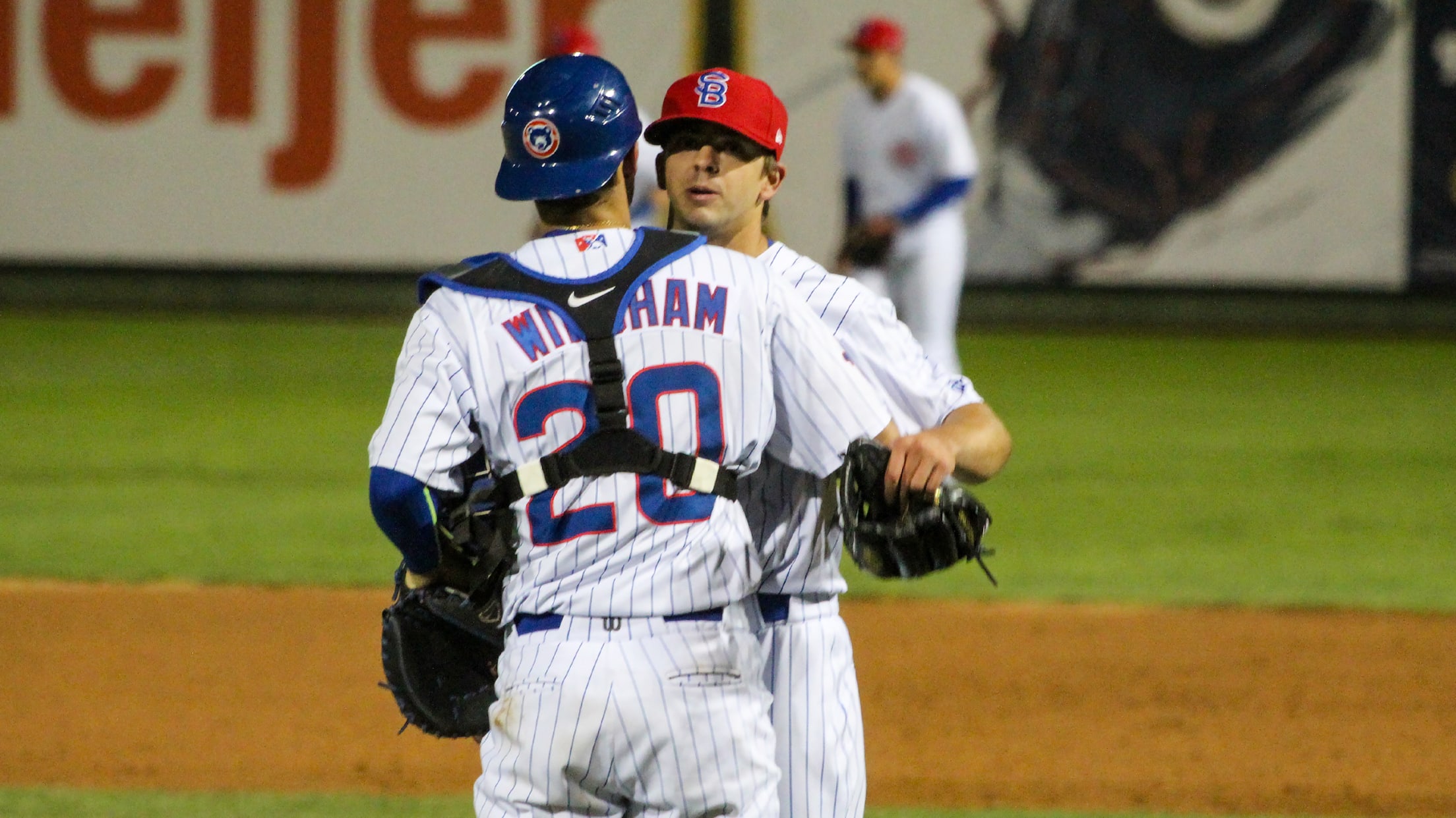 Burl Carraway and Bryce Windham celebrate following the South Bend Cubs 4-3 win over Quad Cities. (Casey McDonald)