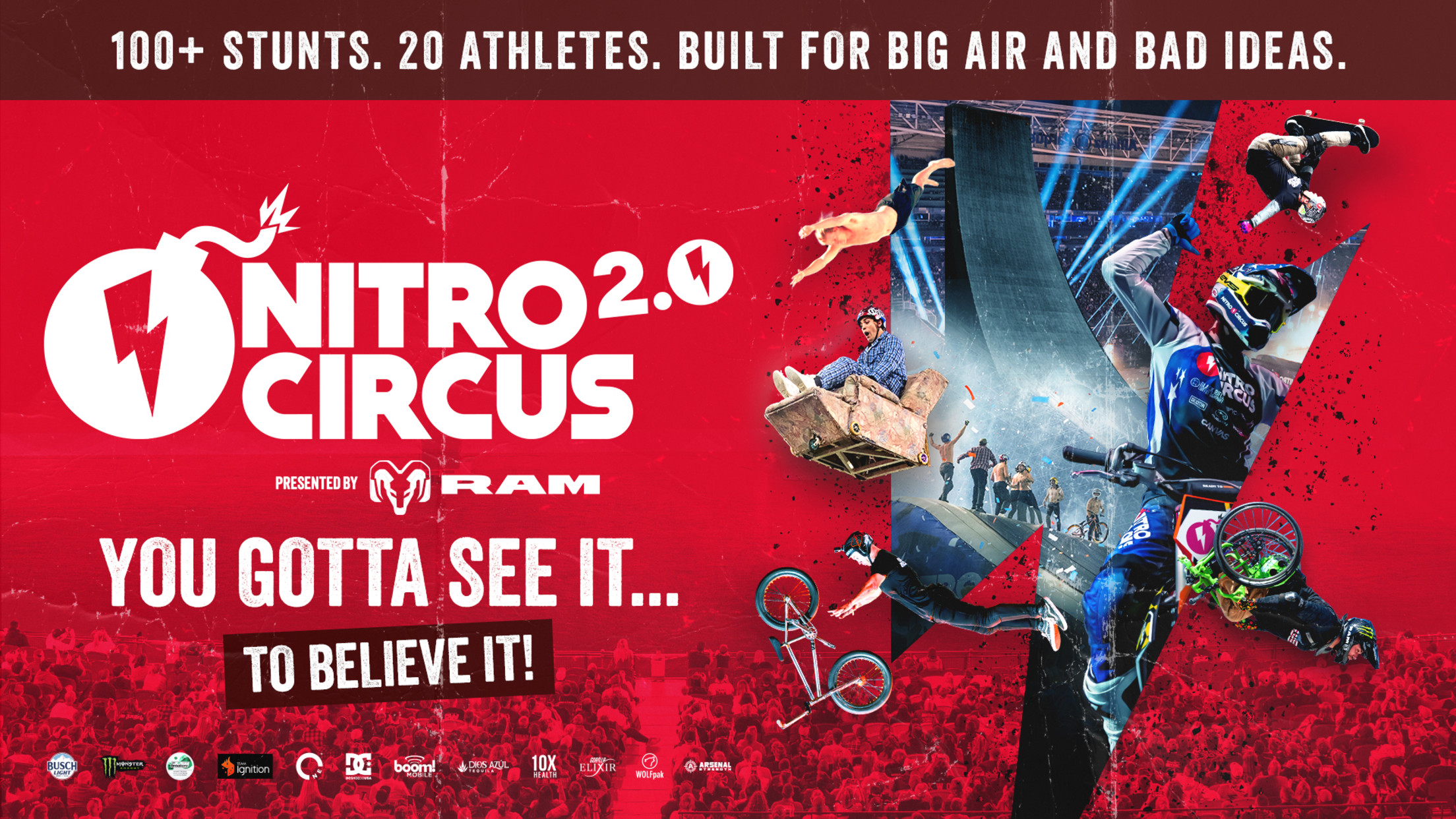 NITRO CIRCUS sponsors include **Ram Trucks, Busch Light, Monster Energy, Lucy Nicotine, Team Ignition, One Water, DC Shoes, Boom Mobile, Dios Azul, 10X Health, Gorilla Elixir, WOLFpak, and Arsenal Strength.