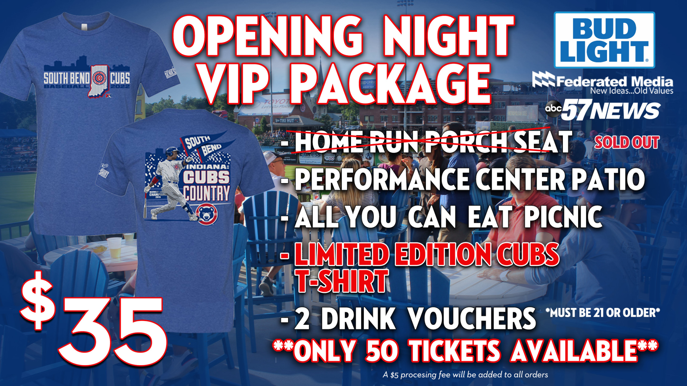 SOUTH BEND, IN – Cubs baseball returns to a full capacity Four Winds Field on Friday, April 8. Enjoy a VIP experience that evening with the Bud Light Opening Night VIP ticket package which will go on sale on March 7 at 10:00 a.m.