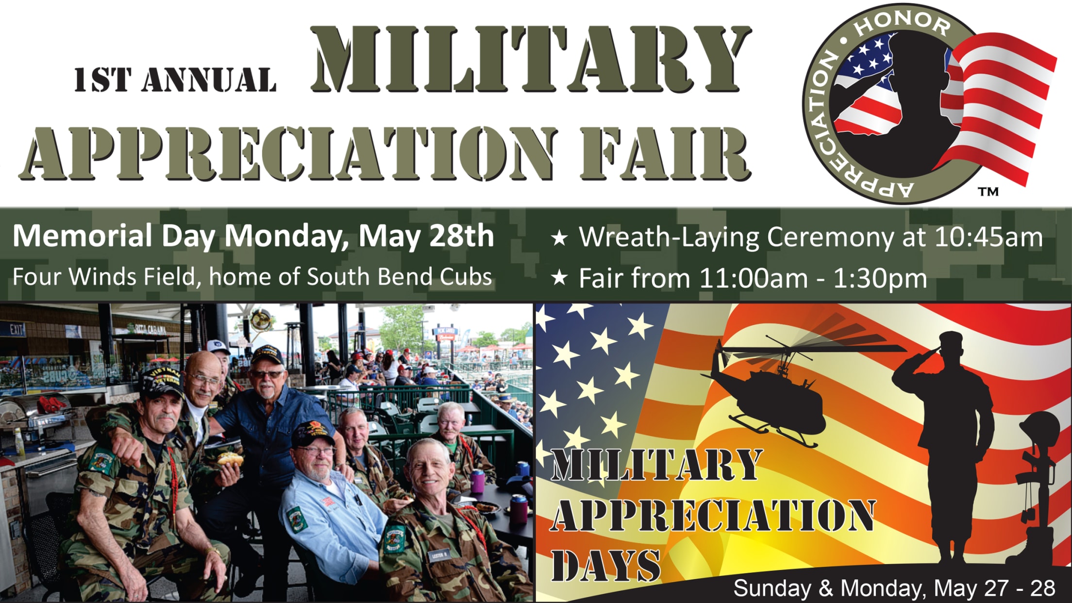 On Memorial Day, Express Employment Professionals and the South Bend Cubs will host the inaugural Military Honor & Appreciation Fair. The event starts at 10:45 a.m. with a special wreath-laying ceremony featuring area dignitaries that include Indiana's 2nd District Congresswoman Jackie Walorski, 95.3 MNC's afternoon radio host Casey Hendrickson, and South Bend Cubs President Joe Hart. Other participants will include the Miller's Vets Color Guard, area Boy & Girls Scouts, and representatives of the Indiana Army National Guard, who will perform TAPS and the National Anthem.