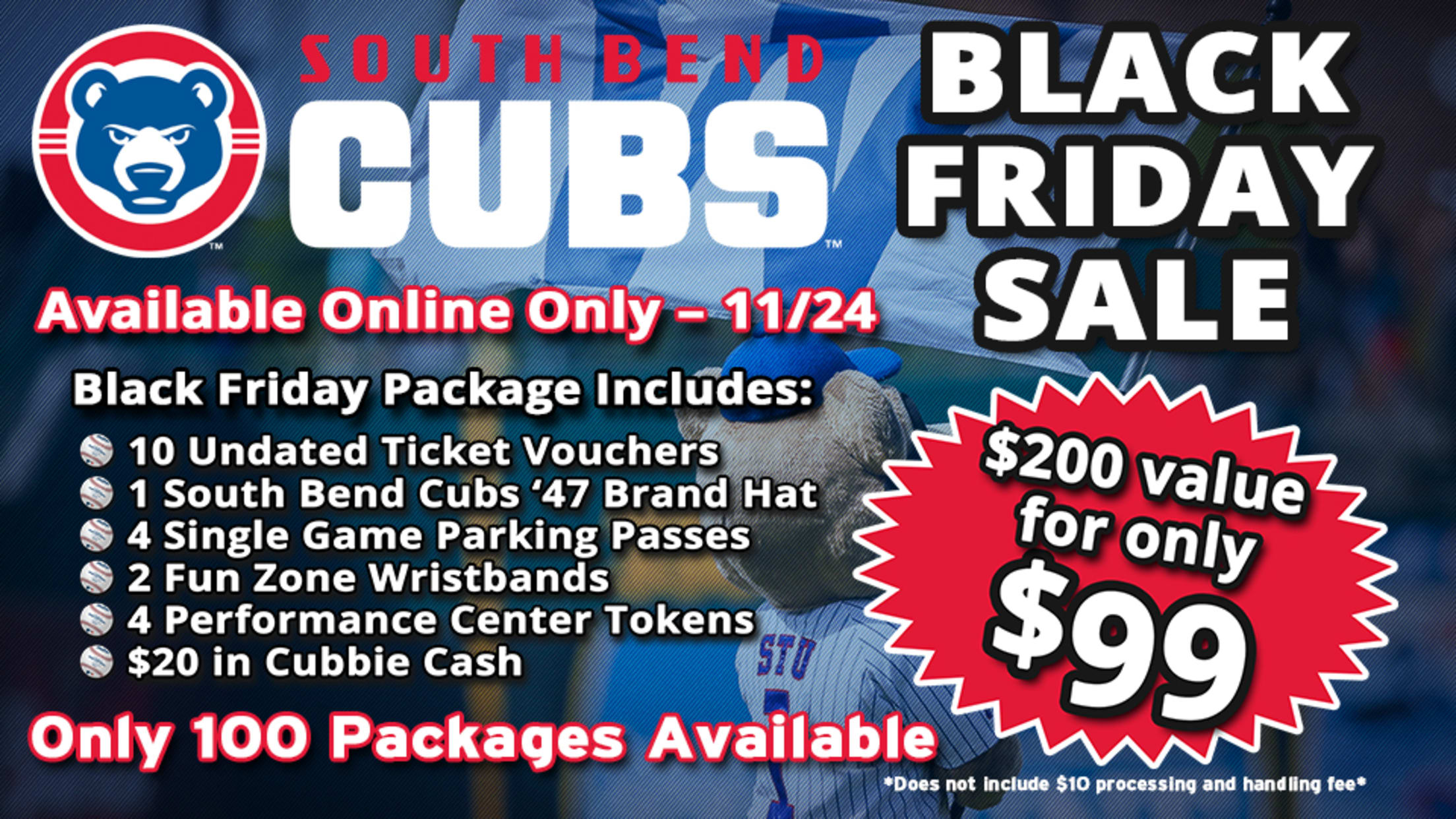 CLICK HERE TO PURCHASE THE BLACK FRIDAY TICKET PACKAGESOUTH BEND, IN - For the 4th consecutive year, the South Bend Cubs will be offering fans their first opportunity to purchase tickets for the upcoming season with a special Black Friday Ticket Package.The Black Friday Ticket Package includes 10 undated ticket