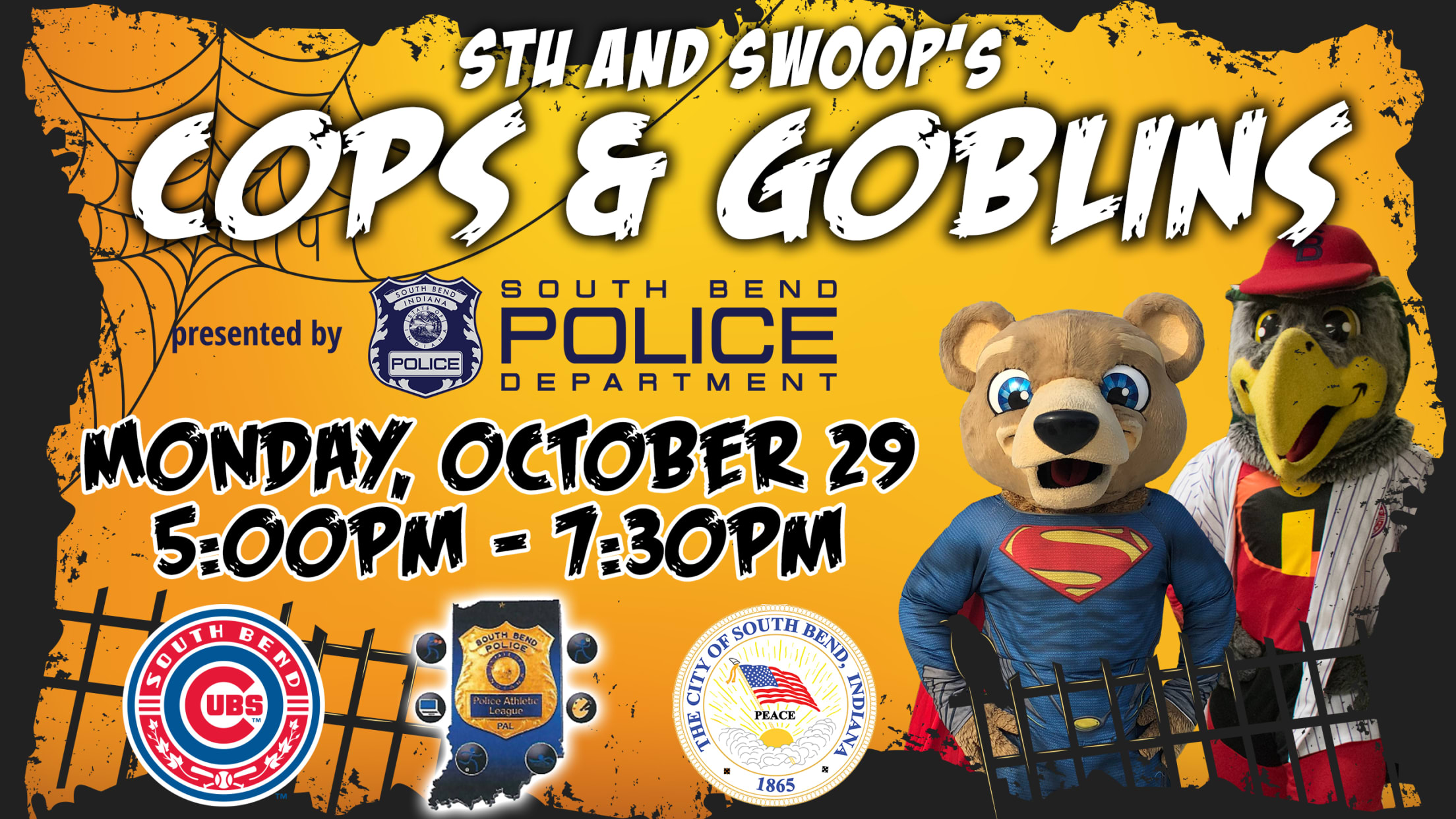 SOUTH BEND, IN - The South Bend Cubs have partnered with the South Bend Police Department to introduce Stu and Swoop's Cops and Goblins trick or treating event taking place on Monday, October 29 from 5:00 P.M.-7:30 P.M at Four Winds Field.