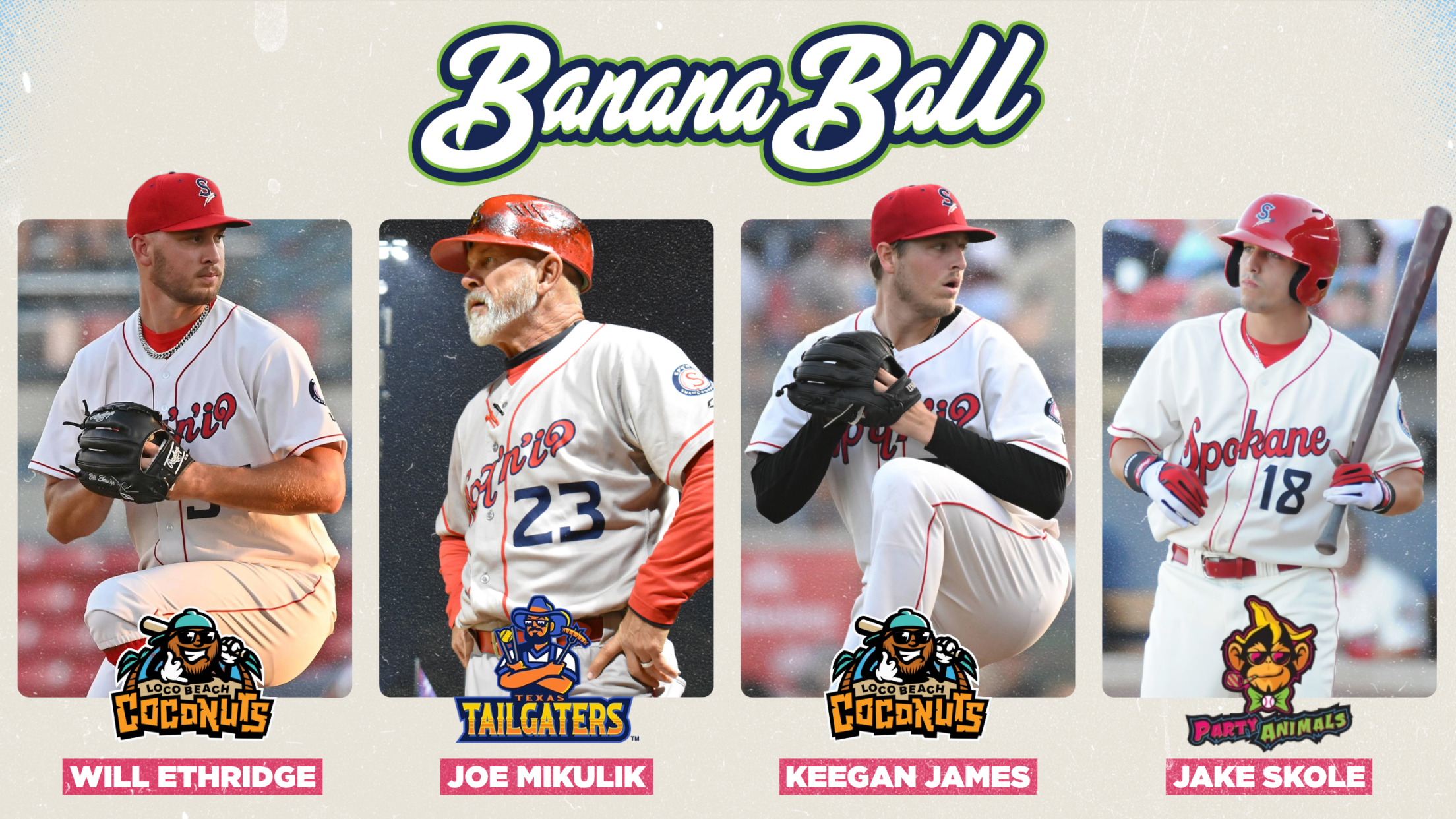 Will Ethridge, Keegan James, Joe Mikulik, and Jake Skole have gone bananas. The quartet of former Spokane Indians are all set to compete in the 2026 Banana Ball World Tour, which kicks off at Dick Howser Stadium in Tallahassee, FL, on Thursday, February 26th. An adapted version of baseball invented