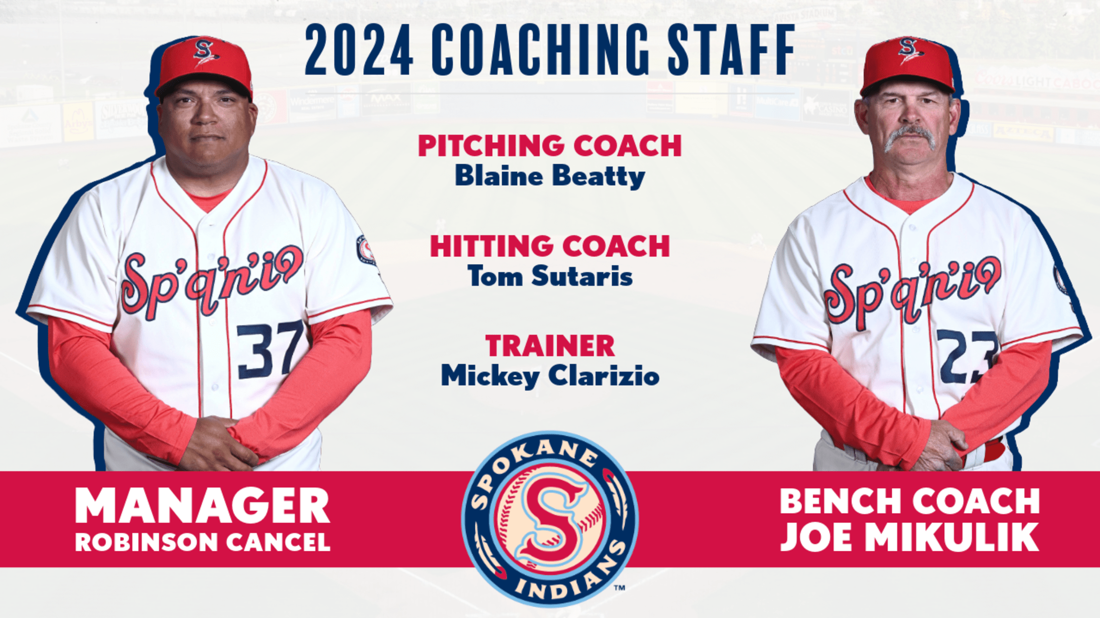 Spokane, Wash. - The Colorado Rockies announced the 2024 field staff for the Spokane Indians today, with former big league catcher Robinson Cancel returning for his second season at the helm. New to the Inland Northwest this year are pitching coach Blaine Beatty and hitting coach Tom Sutaris, while longtime MiLB manager Joe Mikulik rounds out the field staff in his second season as bench coach.