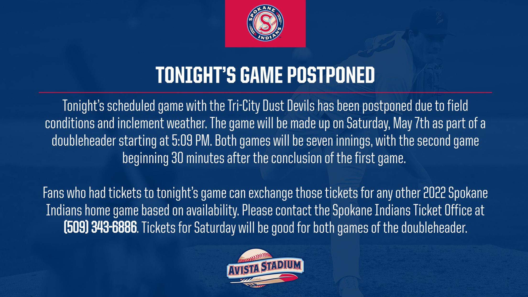 Fans who had tickets to tonight's game can exchange those tickets for any other 2022 Spokane Indians home game based on availability. Please contact the Spokane Indians ticket office at (509) 343-6886 to make your exchange.