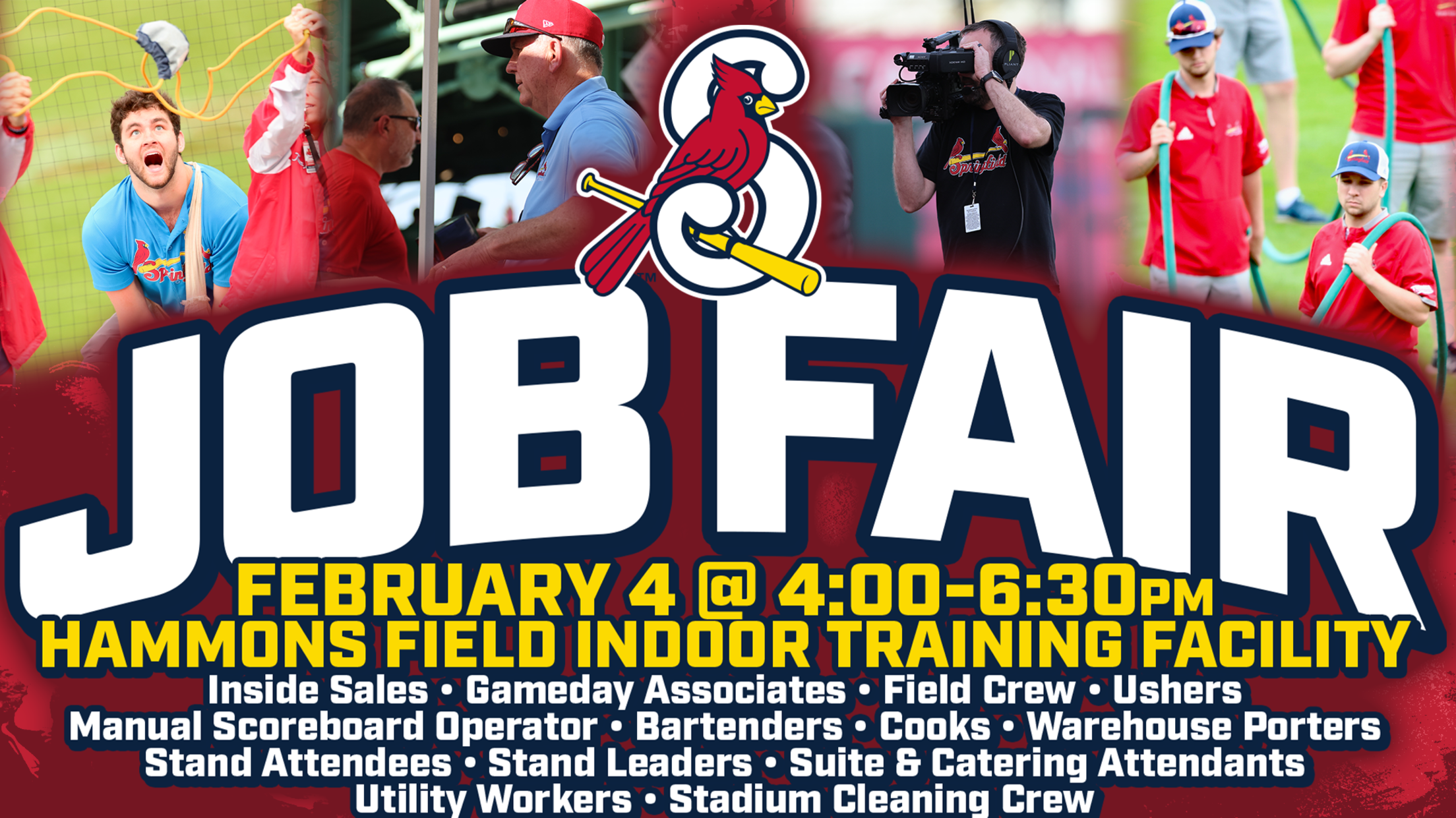 The Springfield Cardinals job fair, originally scheduled for Tuesday, January 27, has been rescheduled to Wednesday, February 4 due to road conditions and poor weather. The Job Fair will take place from 4:00 - 6:30 PM in the Cardinals Indoor Training Facility at Hammons Field. Parking and admission are free.