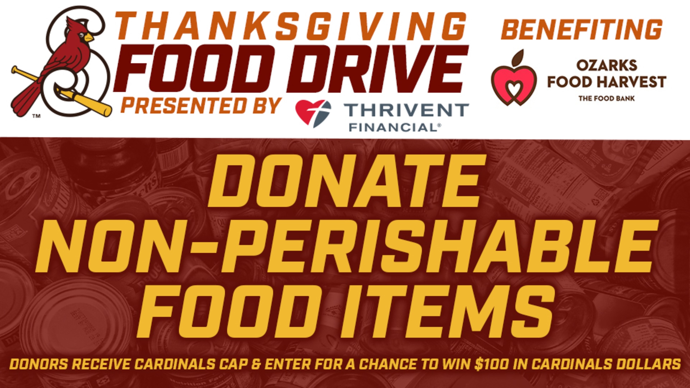 SPRINGFIELD, Mo. -- The Springfield Cardinals and Thrivent Financial are hosting a Thanksgiving Food Drive, benefiting the Ozarks Food Harvest, beginning Thursday, November 8 at Hammons Field. Cardinals employees will begin collecting donations at the Springfield Cardinals Front Office on weekdays at Hammons Field from 9am-5pm. The drive ends November