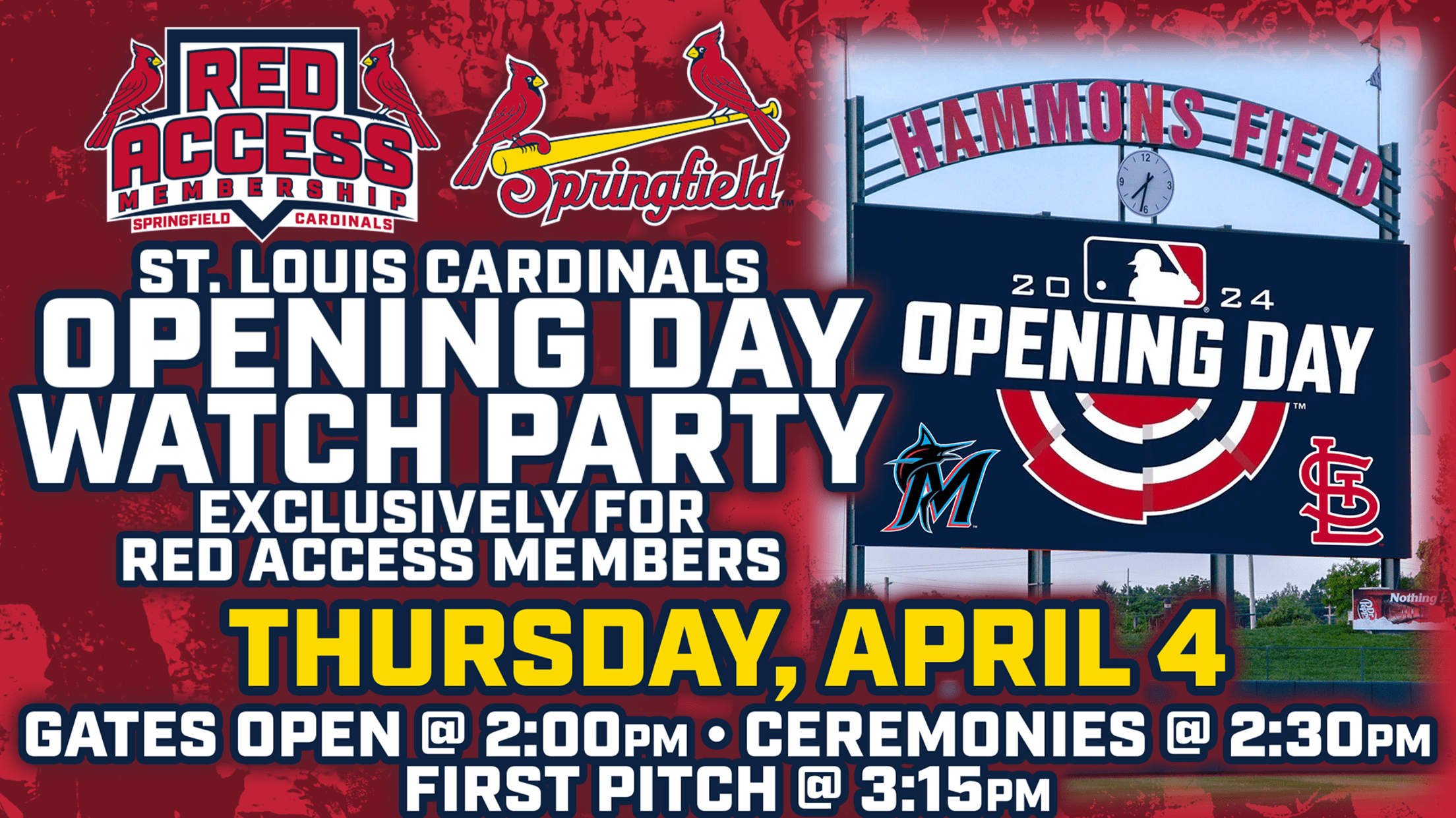 Cardinals Baseball is back! All RED Access members are invited to come to Hammons Field on Thursday, April 4 and enjoy the St. Louis Cardinals Home Opener against the Miami Marlins and Pregame Ceremonies on the Hammons Field Video Board, the biggest TV in southwest Missouri! THE START TIME FOR