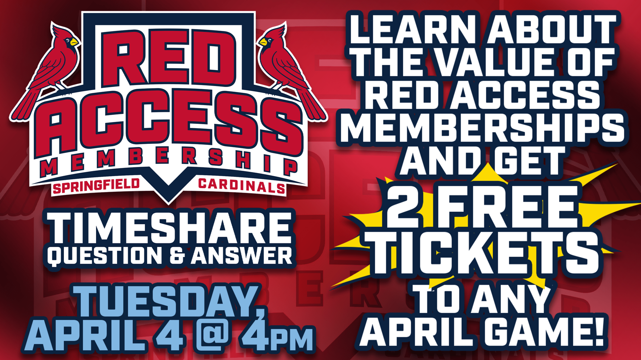 Fans are invited to come to the SpringNet Champions Club at Hammons Field on Tuesday, April 4 at 4pm to hear from Springfield Cardinals Vice President/General Manager Dan Reiter about how a RED Access Membership can fit your lifestyle. Experience ultimate flexibility, savings and value with a RED Access Membership today, starting with seats to 1-2 games per month, exclusive benefits and more for as low as $90.50 (+ tax).