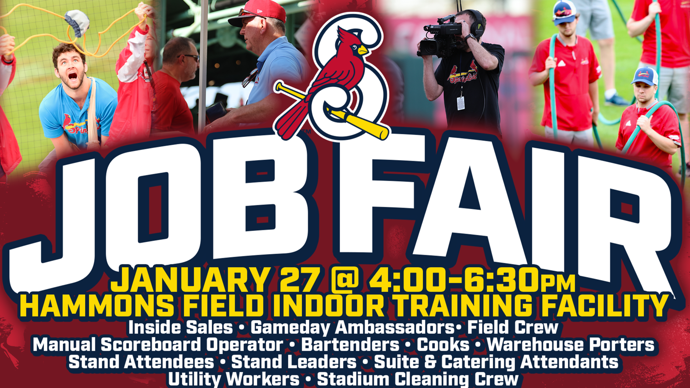 The Springfield Cardinals are excited to host their annual Job Fair to fill seasonal part-time gameday positions for the 2026 season on Tuesday, January 27. The Job Fair will take place from 4:00 - 6:30 PM in the Cardinals Indoor Training Facility at Hammons Field. Parking and admission are free.