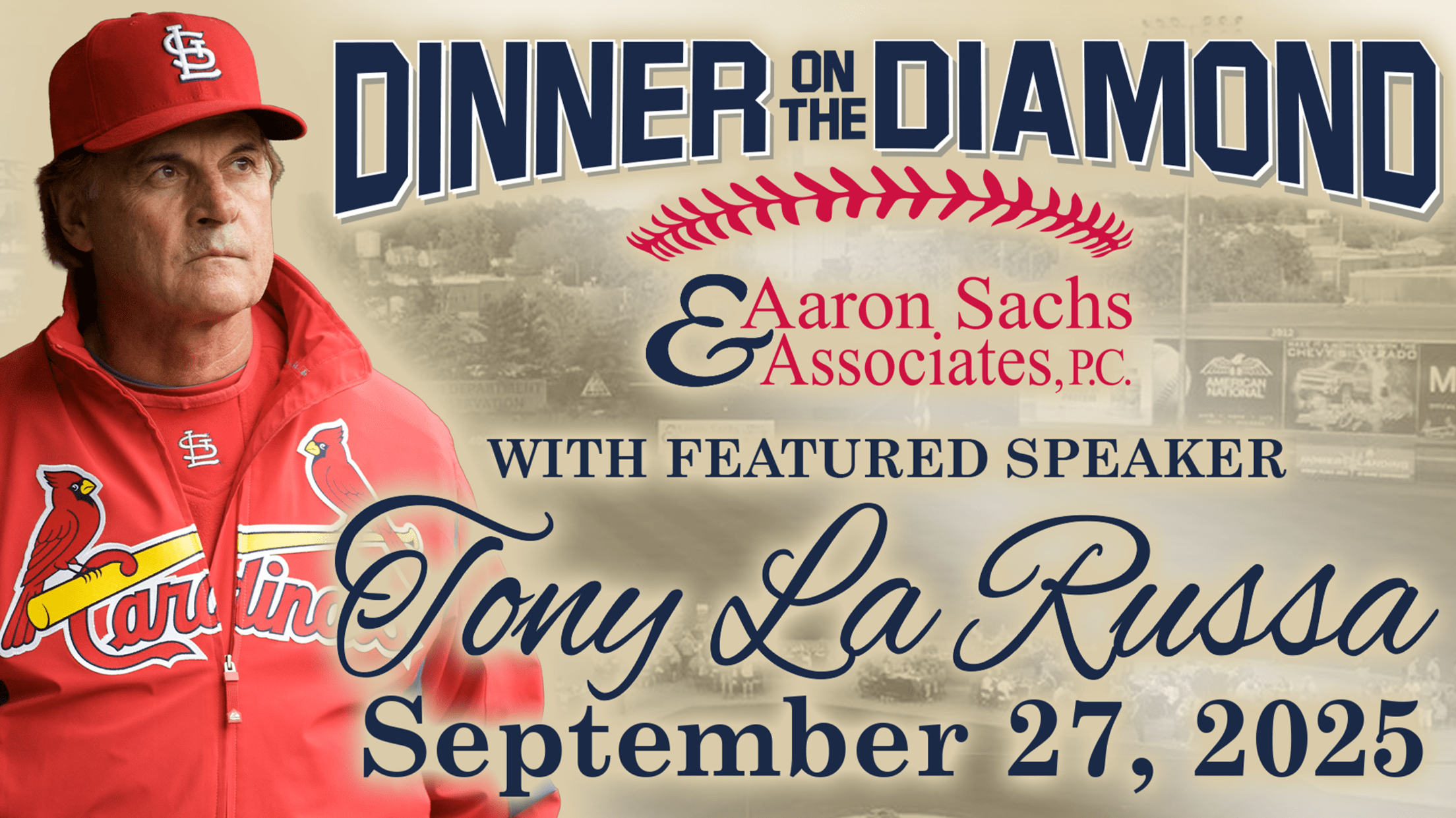 Tickets are on sale now for the 9th Annual Dinner on the Diamond at Hammons Field, presented by Aaron Sachs & Associates, featuring Hall of Famer and World Series Champion Manager Tony La Russa! Hosted by Aaron Sachs & Associates and the Springfield Cardinals on the award-winning infield at Hammons