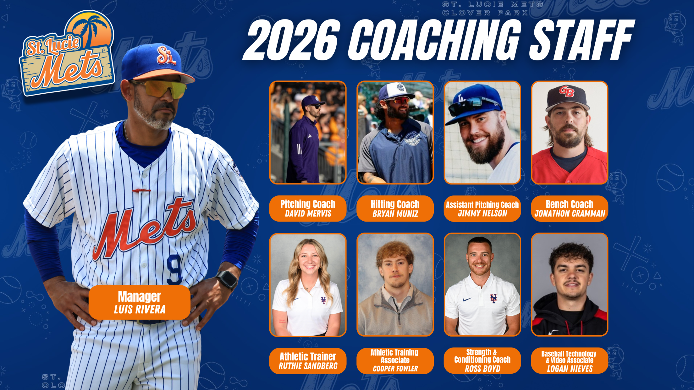 PORT ST. LUCIE, Fla. (January 21, 2026) – The St. Lucie Mets are pleased to announce their coaching staff for the 2026 season. Luis Rivera returns for his second year as manager. He will be joined on the staff by pitching coach David Mervis, hitting coach Bryan Muniz, bench/assistant hitting coach Jonathon Cramman and assistant pitching coach Jimmy Nelson.