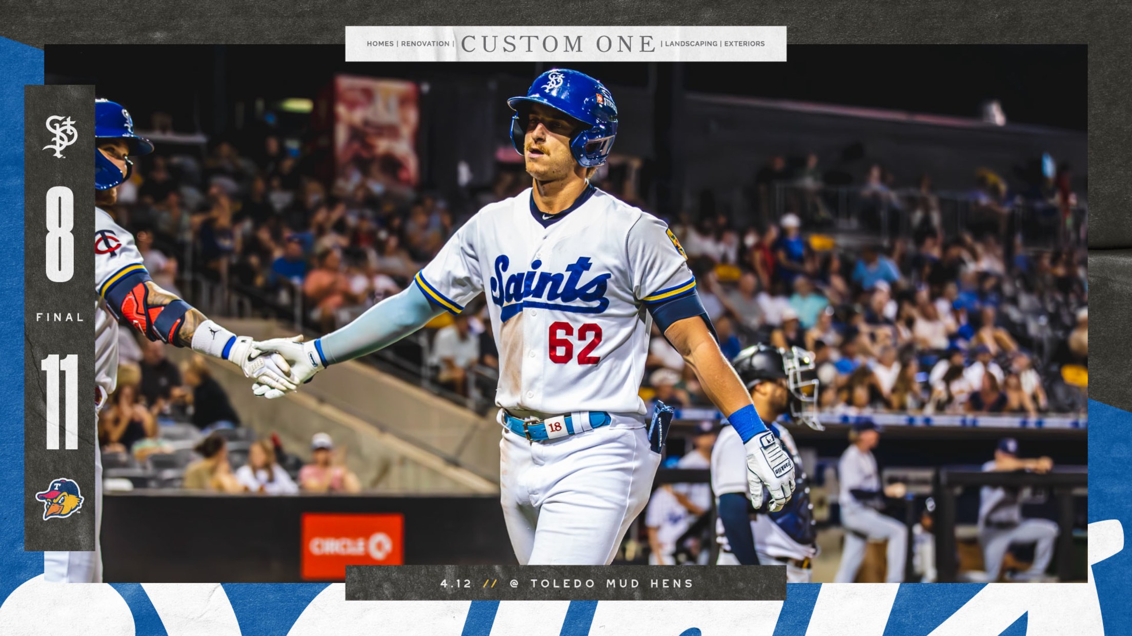 TOLEDO, OH (April 12, 2026) - For eight innings the day belonged to Kyler Fedko. In one of the best days in St. Paul Saints franchise history, he looked like the hero bashing three home runs and finishing with 15 total bases. The ninth inning, however, belonged to the Toledo Mud Hens who scored seven runs in the bottom of the ninth inning, including a walk-off grand slam as the Saints fell 11-8 on Sunday afternoon at Fifth Third Field.
