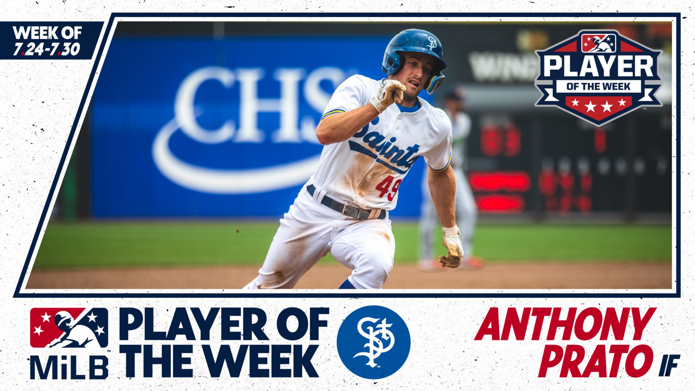 _ST. PAUL, MN _*(July 31, 2023) - *Since being promoted to Triple-A on June 10, Anthony Prato hasn’t stopped hitting. He was finally recognized for the incredible numbers he continues to pile up by being named the International League Player of the Week for the week of July 25-30. Prato becomes the third Saints player this season to receive the honor joining Matt Wallner and Chris Williams.