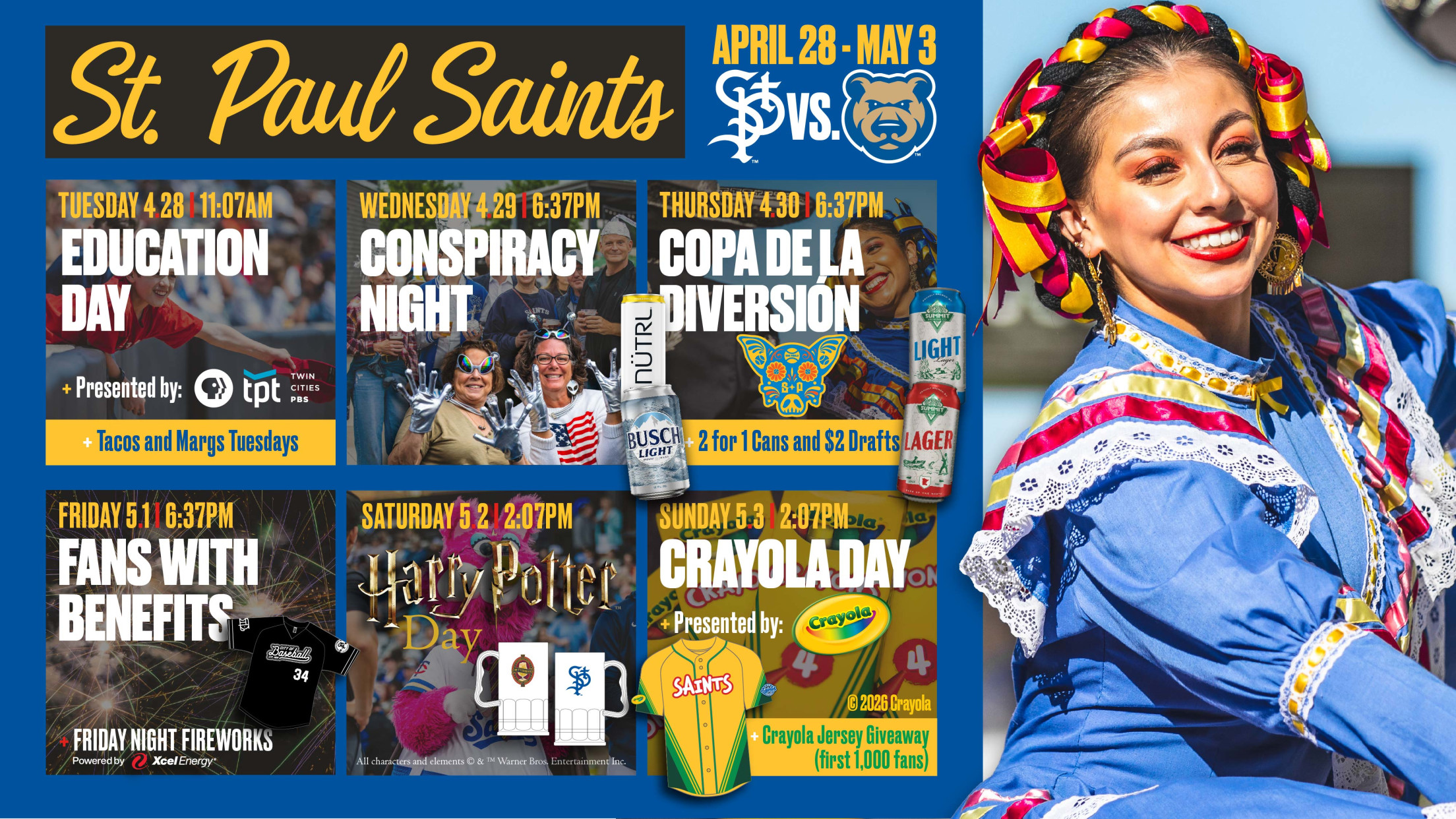 ST. PAUL, MN (April 27, 2026) - Viva La Santos De San Pablo. We’ll educate you on what that means in the most colorful of ways. It’s not a conspiracy that we have the most fun promotions in Minor League Baseball. We’re going to get groovy as we cast some unusual spells that will guarantee you’re laughing for the entire week. So grab those you love and head out to CHS Field for the April 28–May 3 homestand.