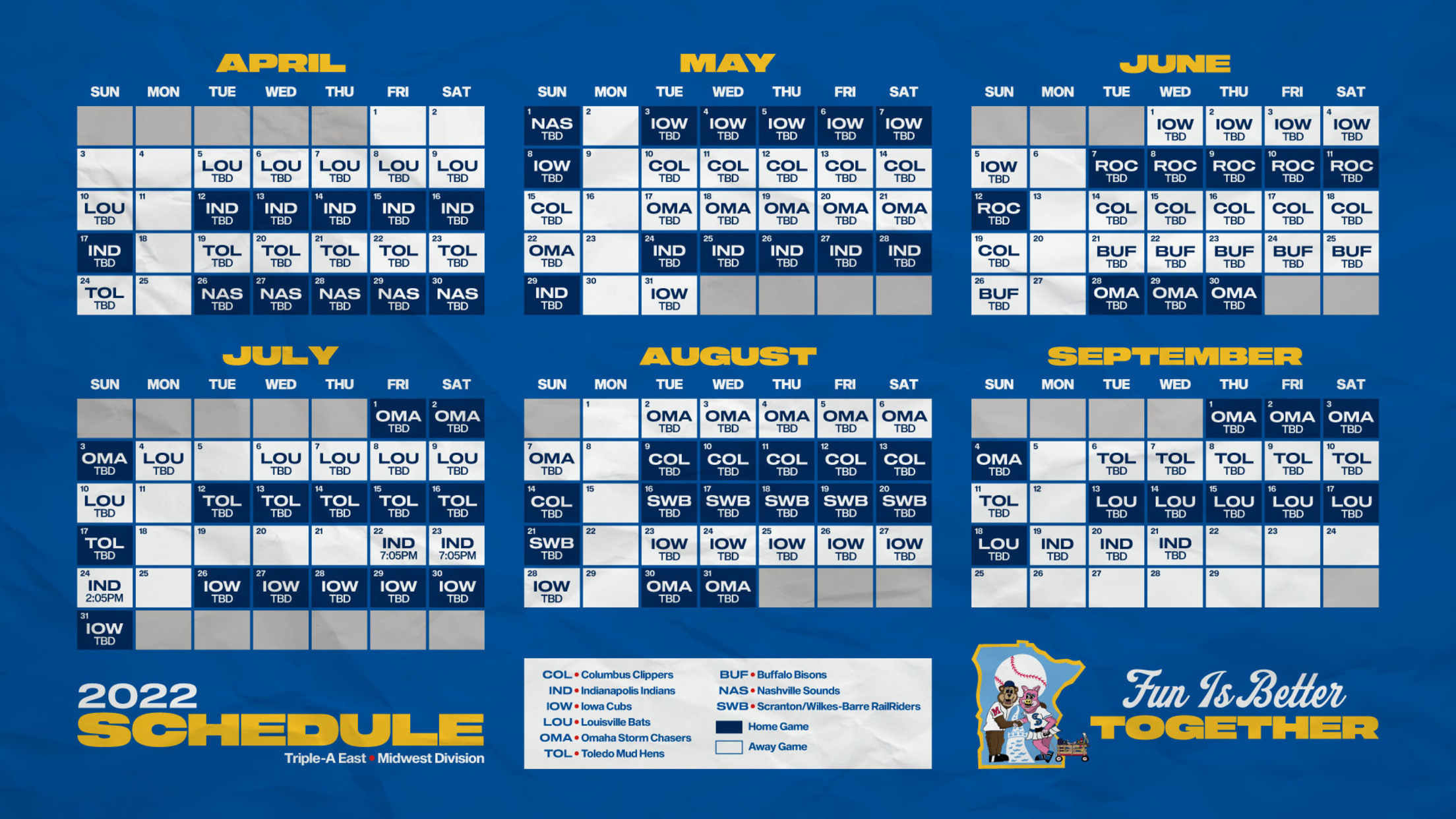 The Saints, who are a part of the Midwest Division, will play their two closest rivals the I-Cubs and Omaha Storm Chasers (Kansas City Royals) a total of 24 times, 12 at home and 12 on the road. They will play the remainder of the division 18 times and breaks down as follows: Clippers (six home and 12 on the road), Indianapolis Indians (12 at home and six on the road), Bats (six home and 12 on the road) and Toledo Mud Hens (Detroit Tigers, six home and 12 on the road). The Saints will play four teams outside of the Midwest Division for the first time in franchise history. They take on three teams from the Northeast Division: Buffalo Bisons (Toronto Blue Jays, six games on the road), former Twins affiliate the Rochester Red Wings (Washington Nationals, six home games), and the RailRiders (six home games). The Saints play one team from the Southeast Division, the Sounds (six home games).