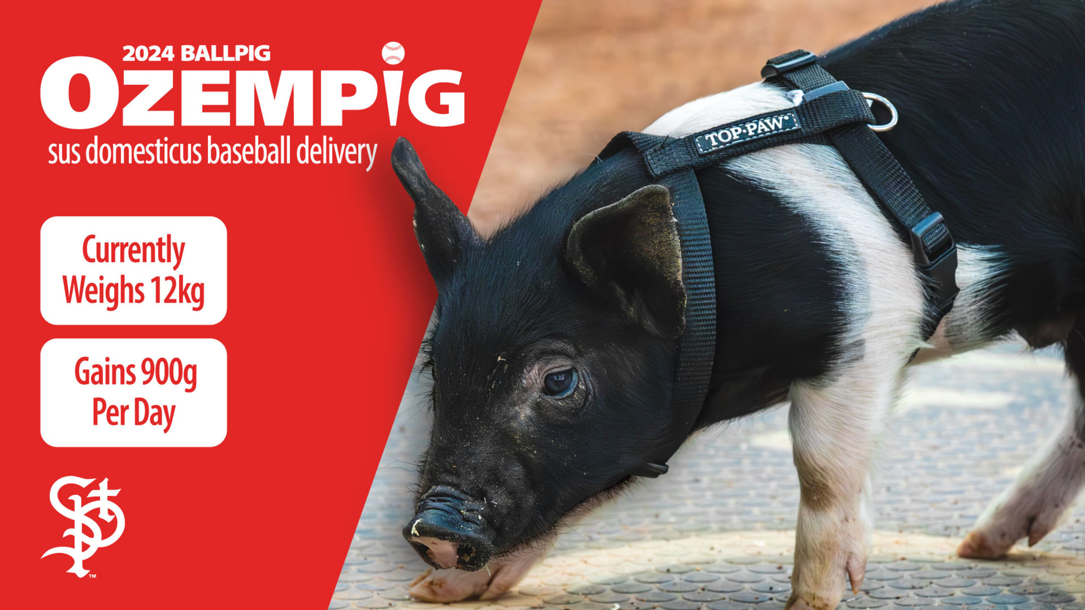 ST. PAUL, MN (March 25, 2024) - Pigs, they’re just like us and the struggles are real. Through the years the St. Paul Saints have trotted out their ball pig to adoring fans night in and night out for the entirety of the summer. On the outside they put on a smile and raise their snout to acknowledge the crowd. Inside, however, their heart drops as the crowd is told they put on an average of two pounds per day during the season. While true, this little piece of information leaves them self-conscious. As the Saints were searching for their 2024 pig, the competition was fierce as celebrities, award-winning films, and big-time athletes made a run at being crowned the winner. One pig, however, stood out above all the rest promising to change the way pigs are viewed by the rest of the world. He promises to spend the first half of the season in the best shape possible, curb the five to seven pounds of food he eats in a day, and bring a positive light to his name as the Saints unveil their 2024 ballpig…OzemPig.