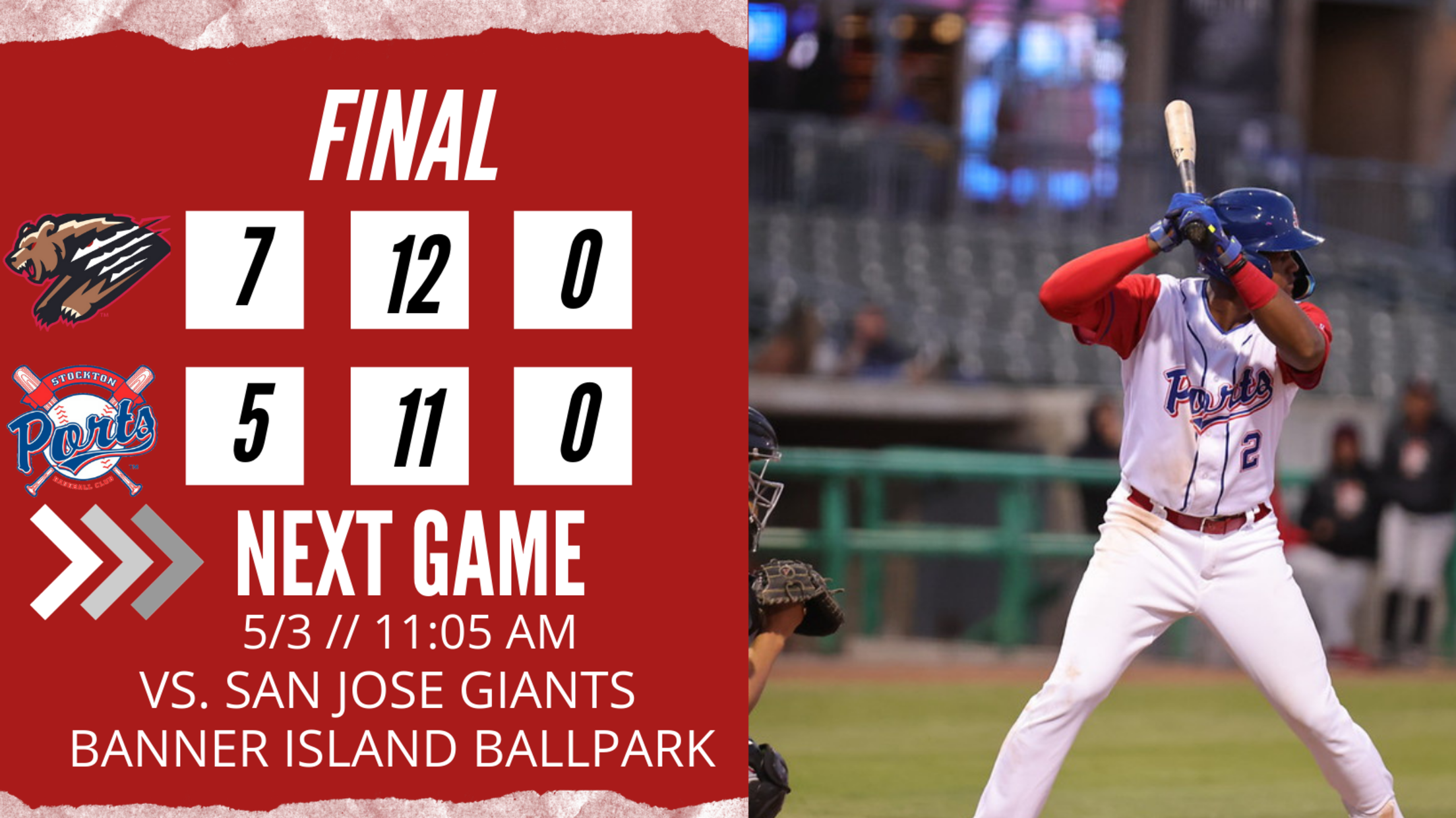 STOCKTON, Ca. – The Ports outscored the Fresno Grizzlies over eight and a half innings but could not overcome a five-run top of the first as Stockton dropped its seventh straight with a 7-5 loss on Sunday afternoon at Banner Island Ballpark.