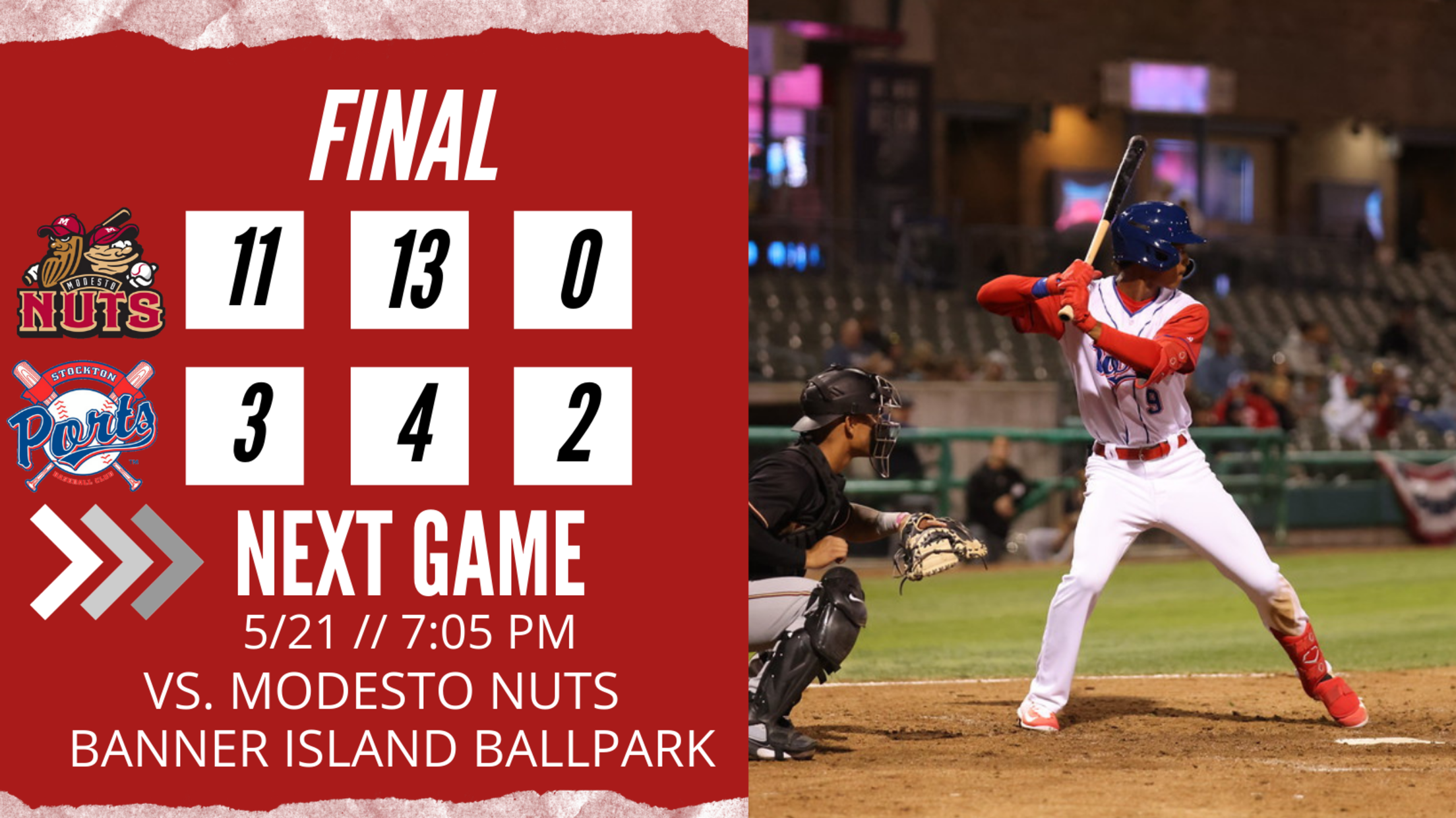 STOCKTON, Ca. – The Modesto Nuts scored five runs in the top of the second inning and never looked back as the Ports saw their five-game winning streak come to an end with an 11-3 loss to their North Division rival on Friday night at Banner Island Ballpark.