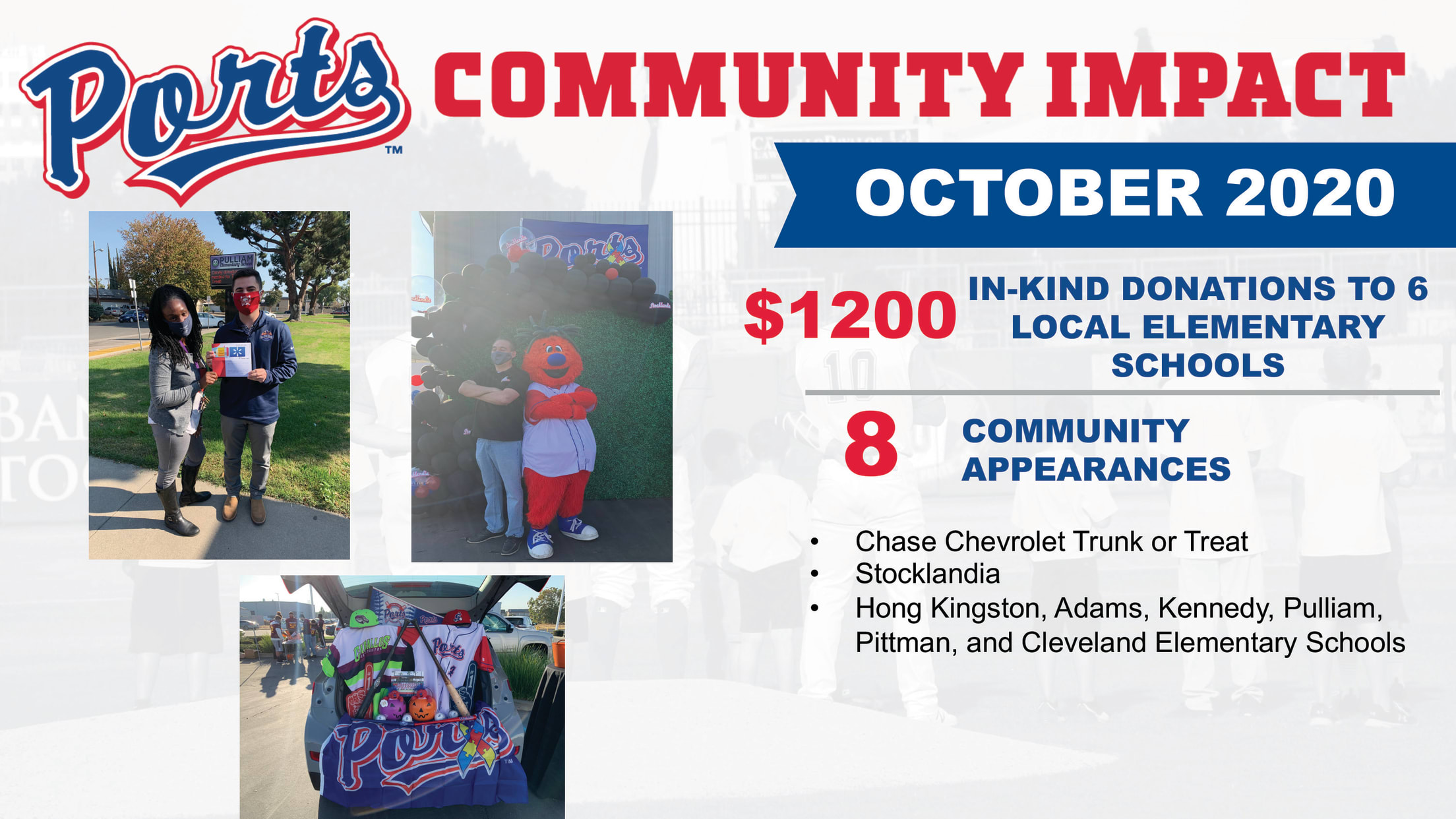 In the month of October, The Stockton Ports delivered $200 worth of gift cards to six different schools in our local community. After raising $1,200 through a Virtual Back to School Drive, The Ports were able to purchase gift cards to support Hong Kingston, Pittman, Pulliam, Cleveland, Kennedy, and Adams