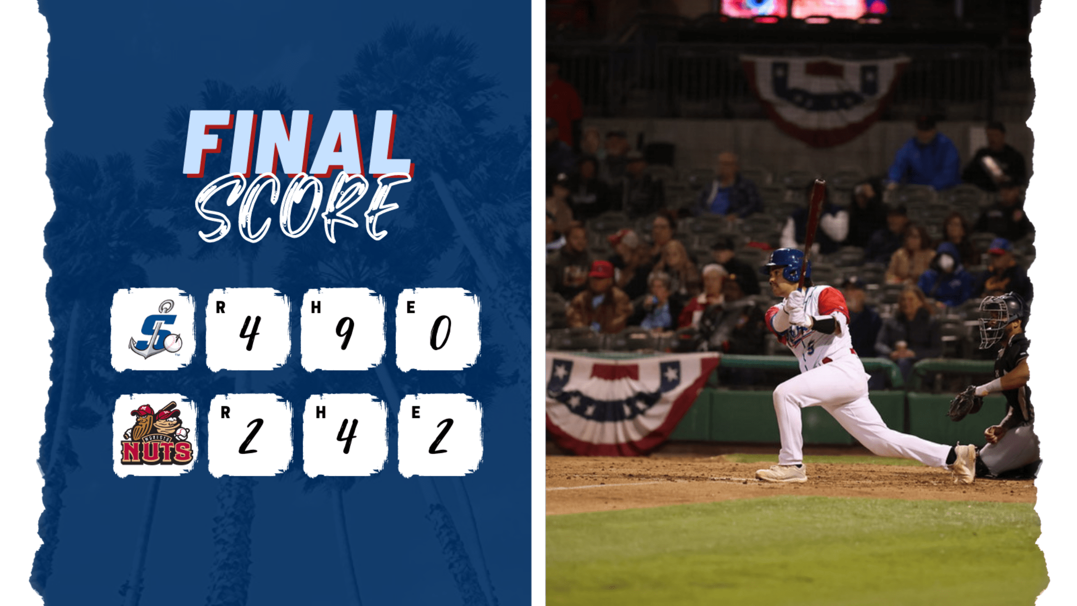 After the two teams traded single runs again in the third, the Ports on an RBI single by Junior Perez and the Nuts on an RBI single by Robert Perez, Jr., Stockton took the lead for good in the top of the fourth inning. CJ Rodriguez led off with a single up the middle and reached second base when Nick Brueser drew a walk. On a fake bunt Wilson Alvarez swung away and hit a ground ball to the vacated left side of the infield where Nuts’ shortstop Edwin Arroyo dove and deflected the ball into shallow left allowing pinch-runner Mariano Ricciardi to score from second base to give the Ports a 3-2 lead. After an error on Arroyo loaded the bases, Brueser scored from third base when Alexander Campos grounded into a 6-4-3 double play to extend the Stockton advantage to 4-2.