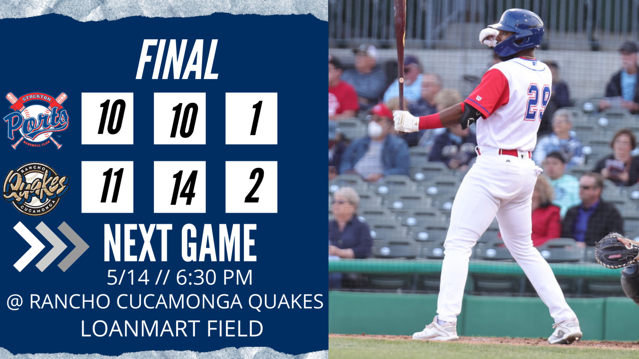 Rancho Cucamonga, Calif.- Stockton waged one of the largest comebacks of the season but couldn't quite get over the hump and lost a wild one on Friday night in Rancho Cucamonga, 11-10. The Ports plated an unearned run in the top of the 1st on a Denzel Clarke base hit,