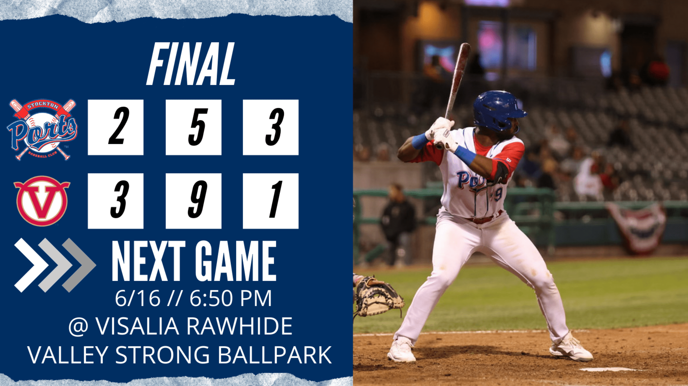 ISALIA, Ca. – The Ports managed just five hits while leaving ten runners on base as Stockton fell to the Rawhide 3-2 on Wednesday night at Valley Strong Ballpark in Visalia.