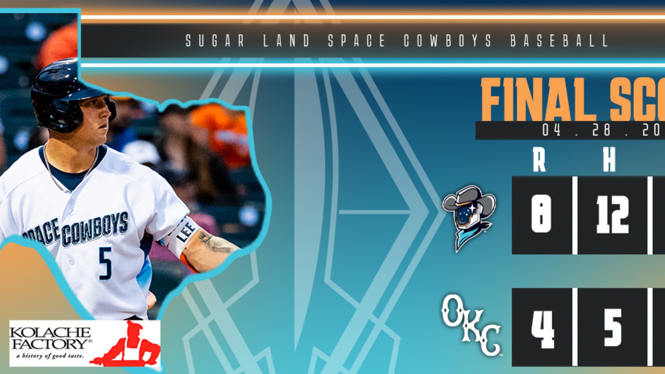 (OKLAHOMA CITY, Okla.) – Korey Lee blasted his third home run of the year as the Sugar Land Space Cowboys won 8-4 over the Oklahoma City Dodgers on Thursday night at Chickasaw Bricktown Ballpark.
