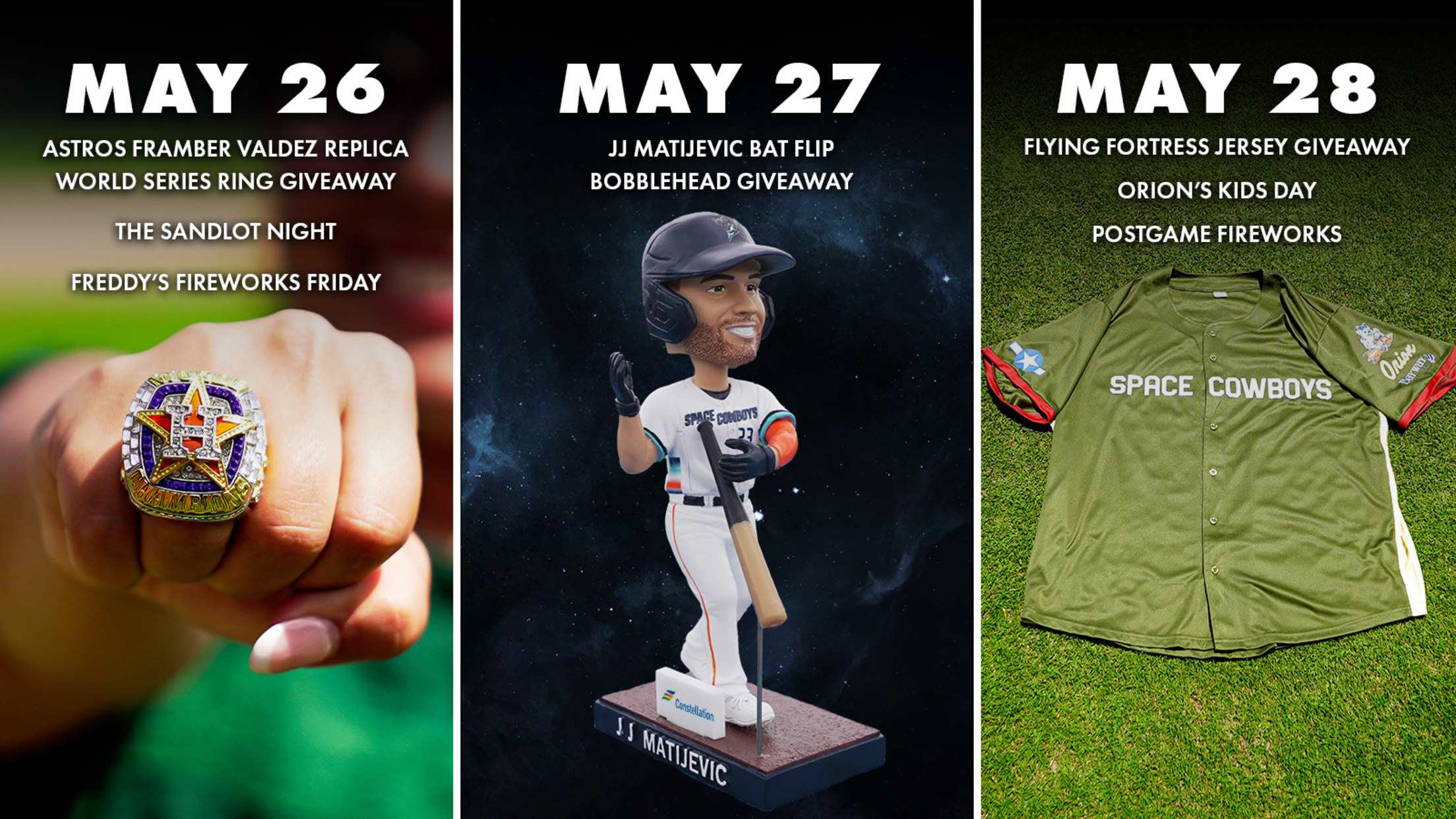 Memorial Day weekend continues at Constellation Field with the Space Cowboys second bobblehead giveaway of the year. The first 2,000 fans will receive a JJ Matijevic Bat Flip Bobblehead as they enter the gates presented by Constellation.