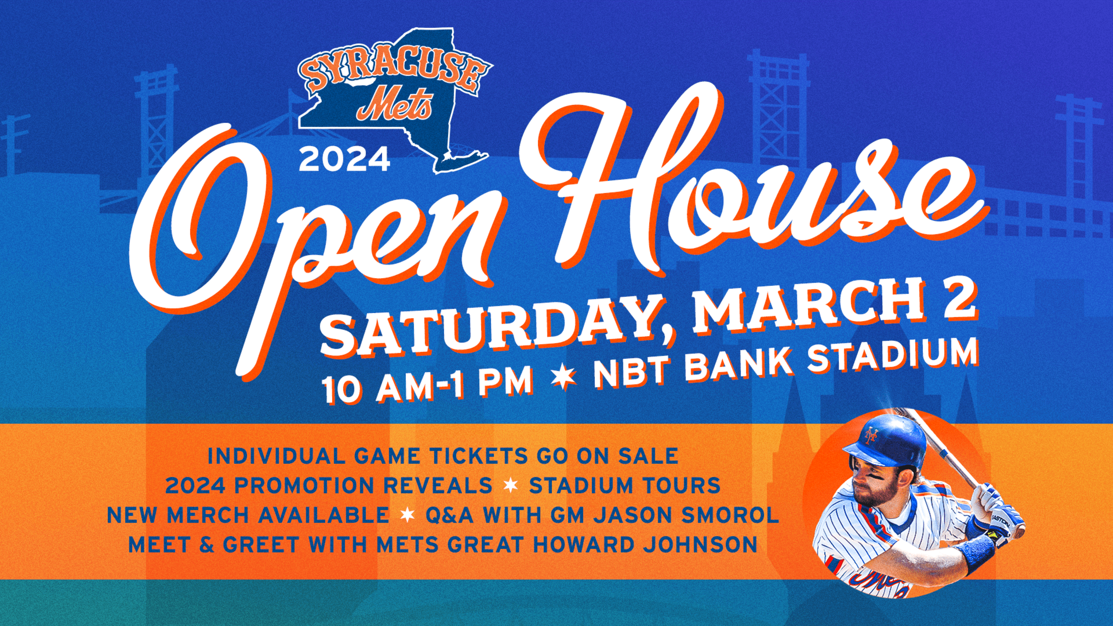 SYRACUSE, NY – The Syracuse Mets 2024 Open House will take place at NBT Bank Stadium on Saturday, March 2nd from 10 a.m. to 1 p.m. Individual game tickets will go on sale for the 2024 season at 10 a.m. that day and fans will be able to take stadium